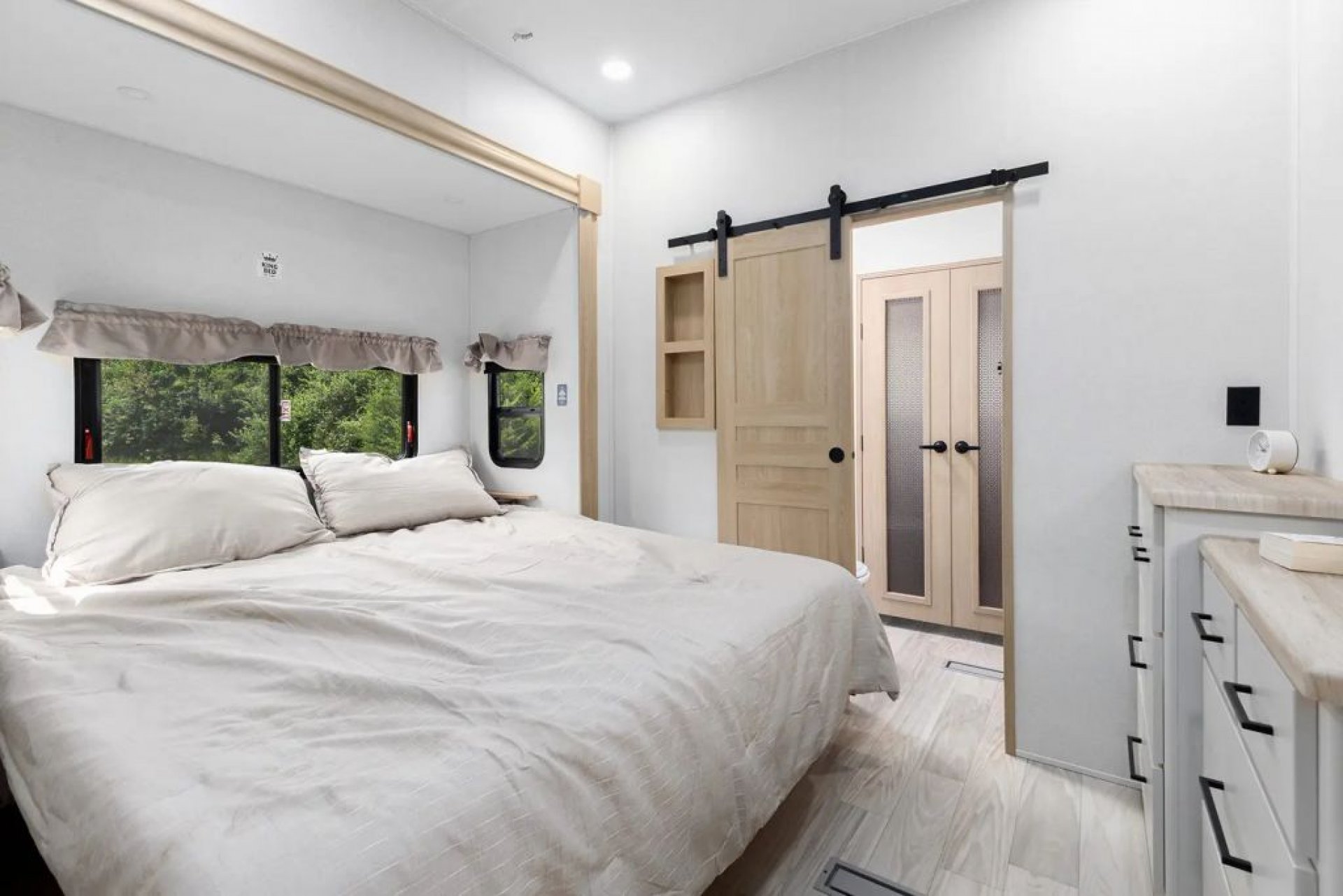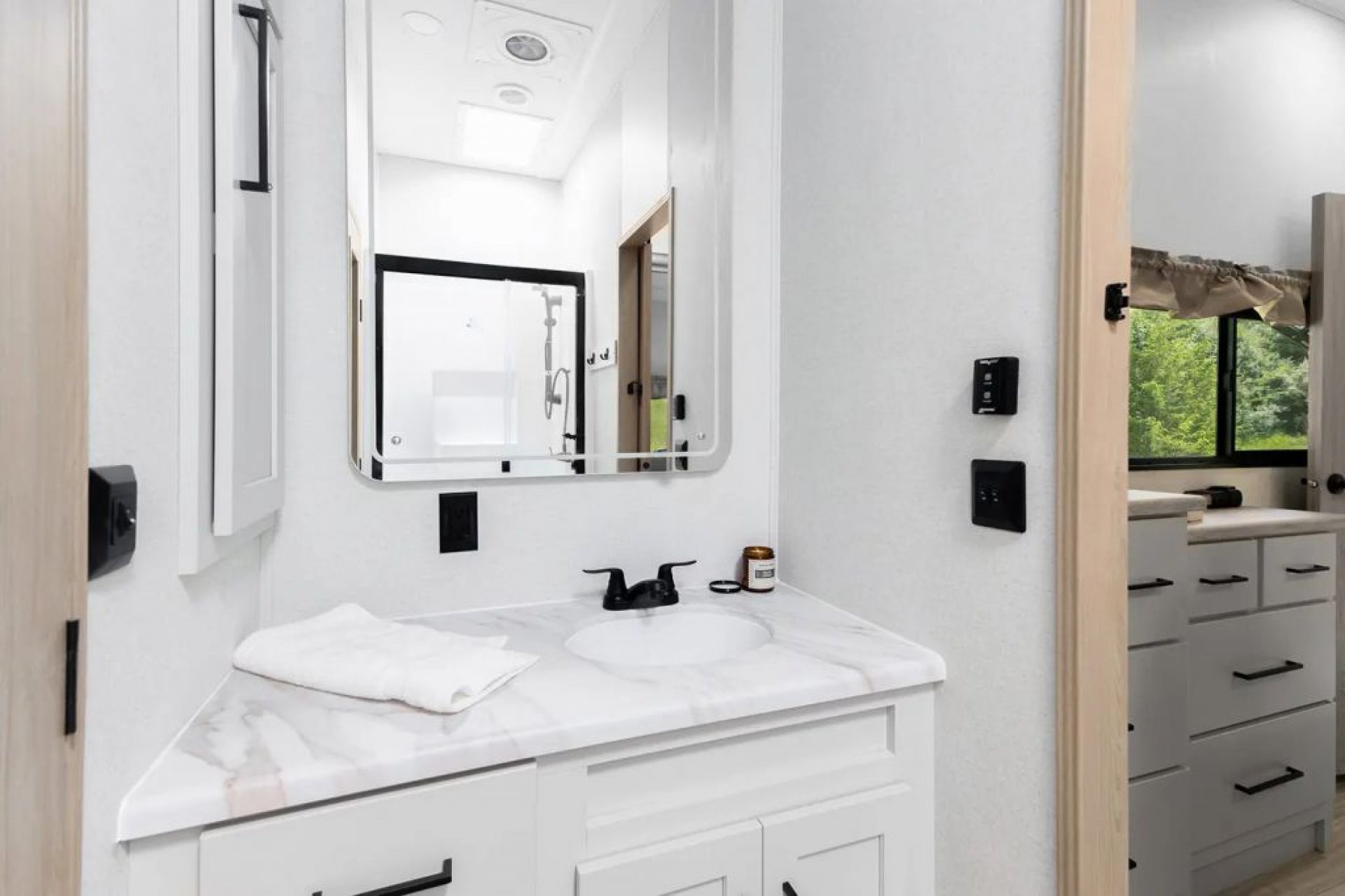 - Front Bedroom: Private master suite with a king bed (72" x 80"), dual wardrobes, overhead storage, and an adjacent full front bathroom featuring a walk-in shower, dual sinks, and linen closet.