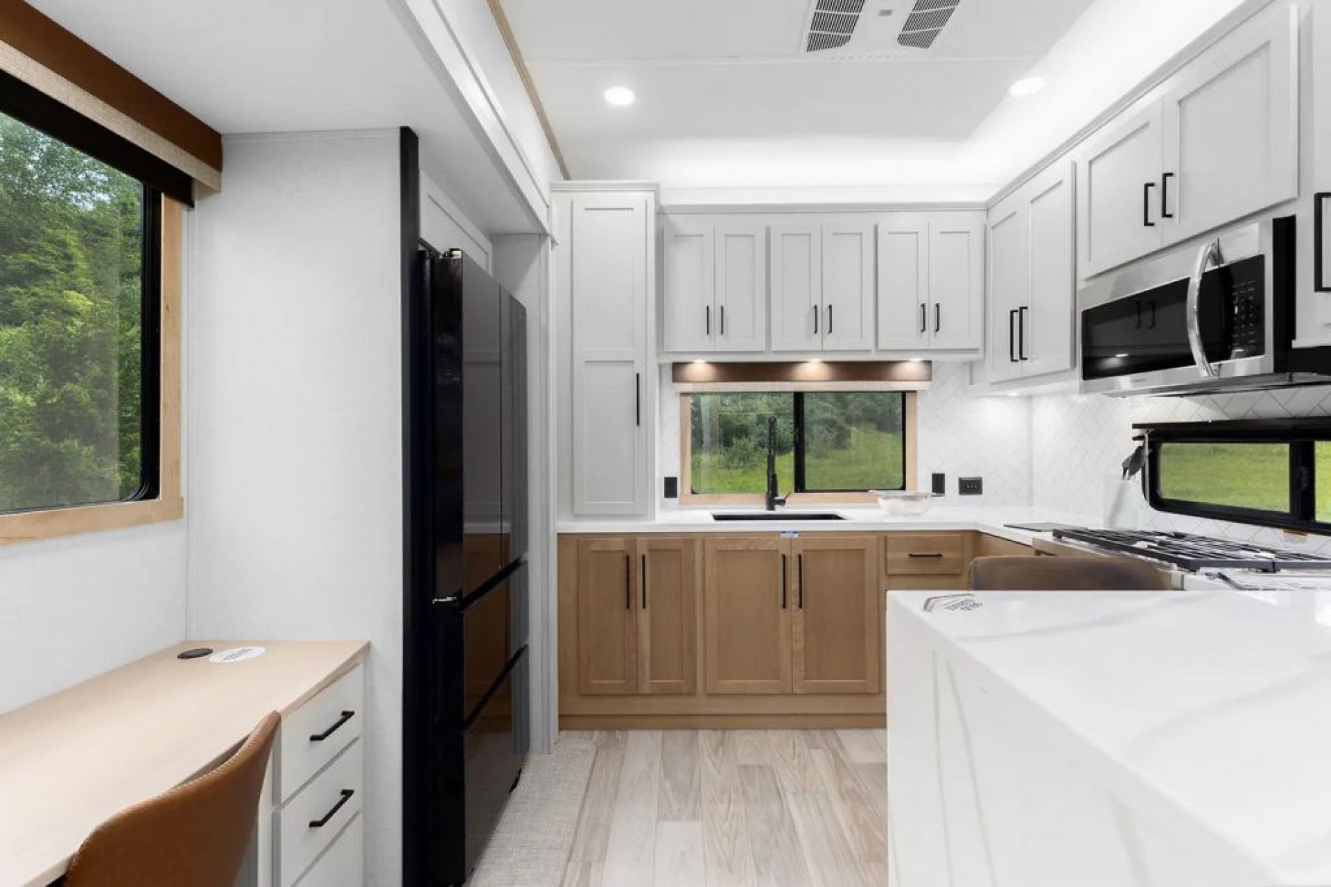 - Kitchen: Rear U-shaped kitchen with island prep, residential refrigerator, oven, and ample counter space; includes a desk and chair for a home office nook.