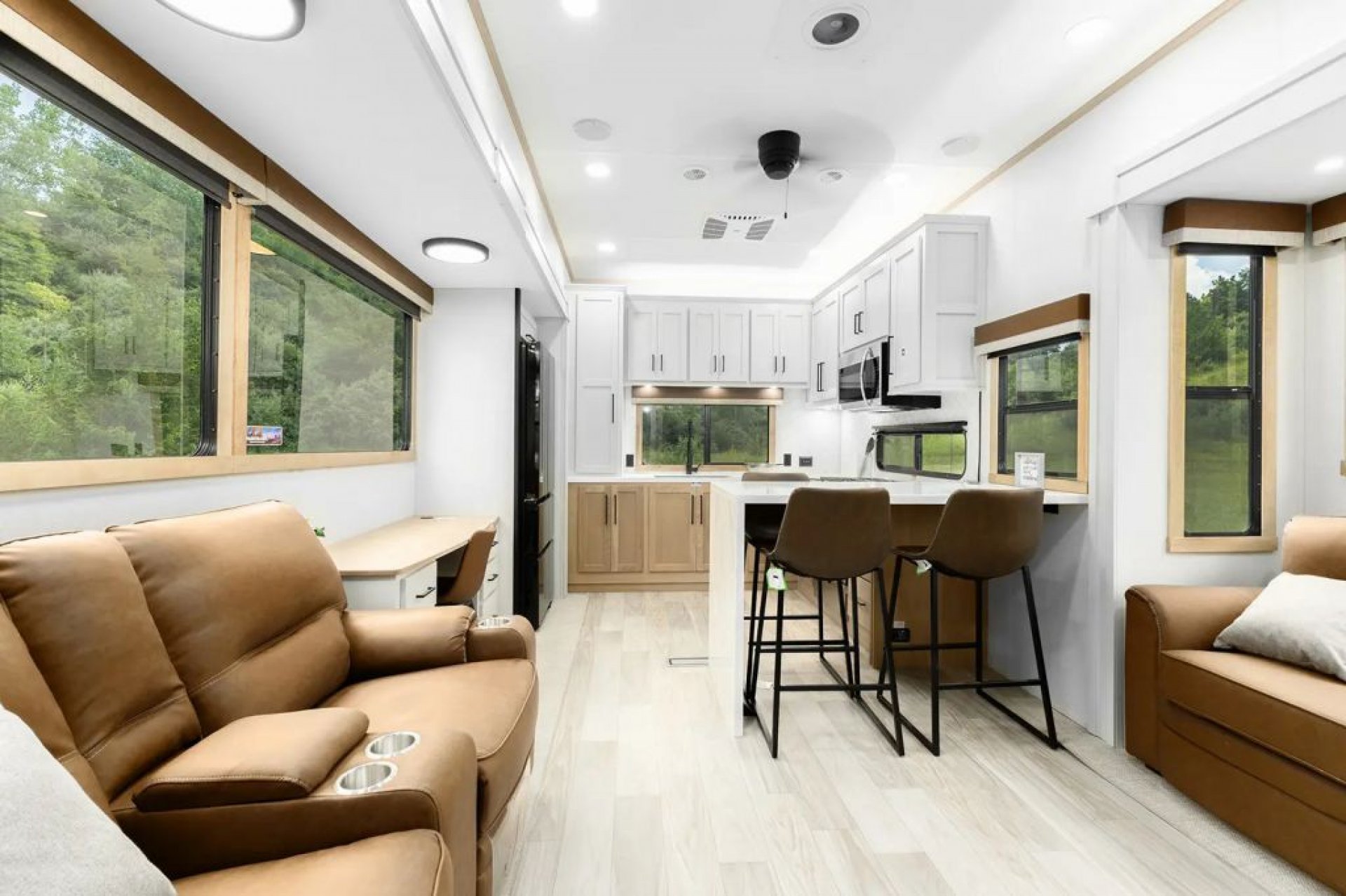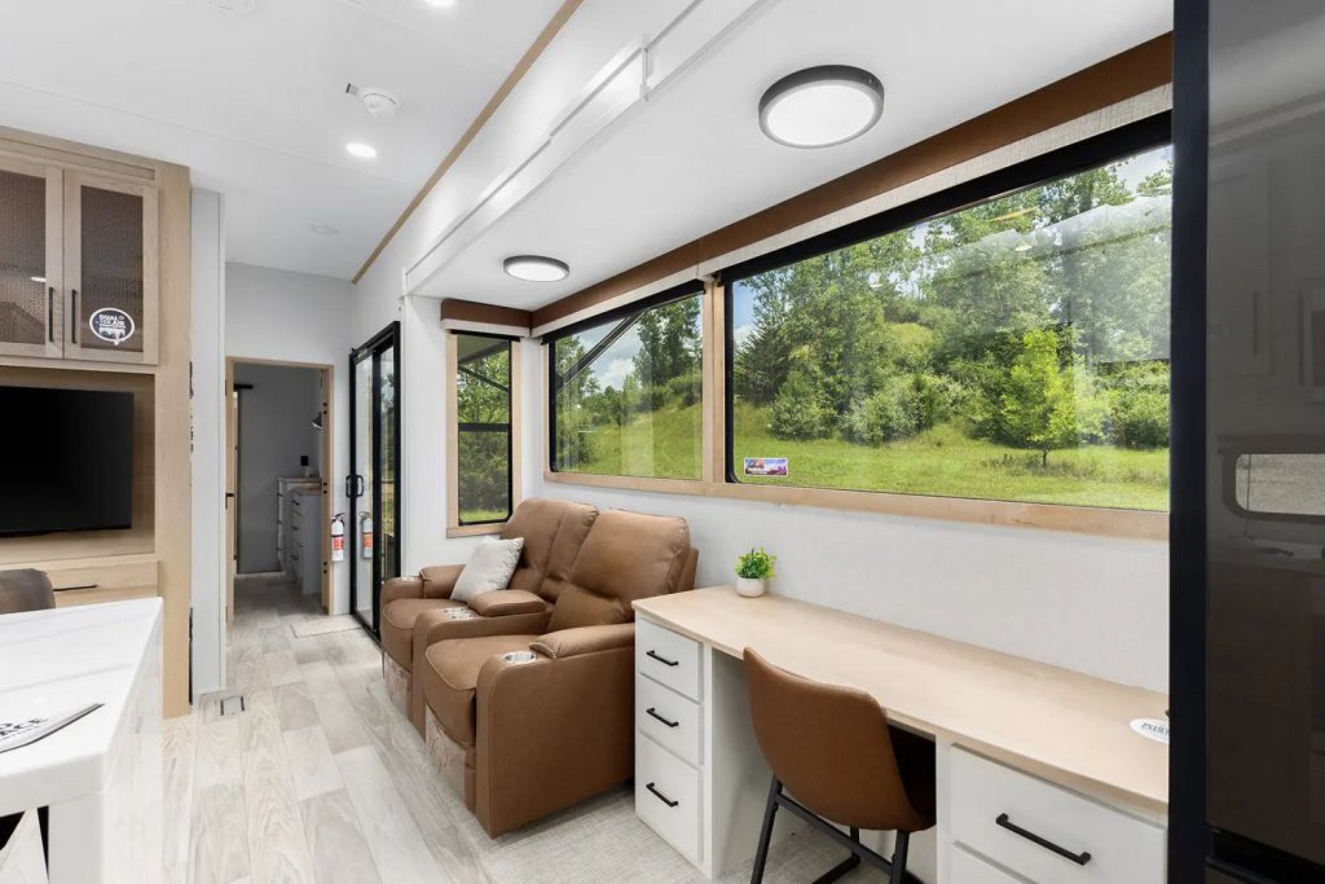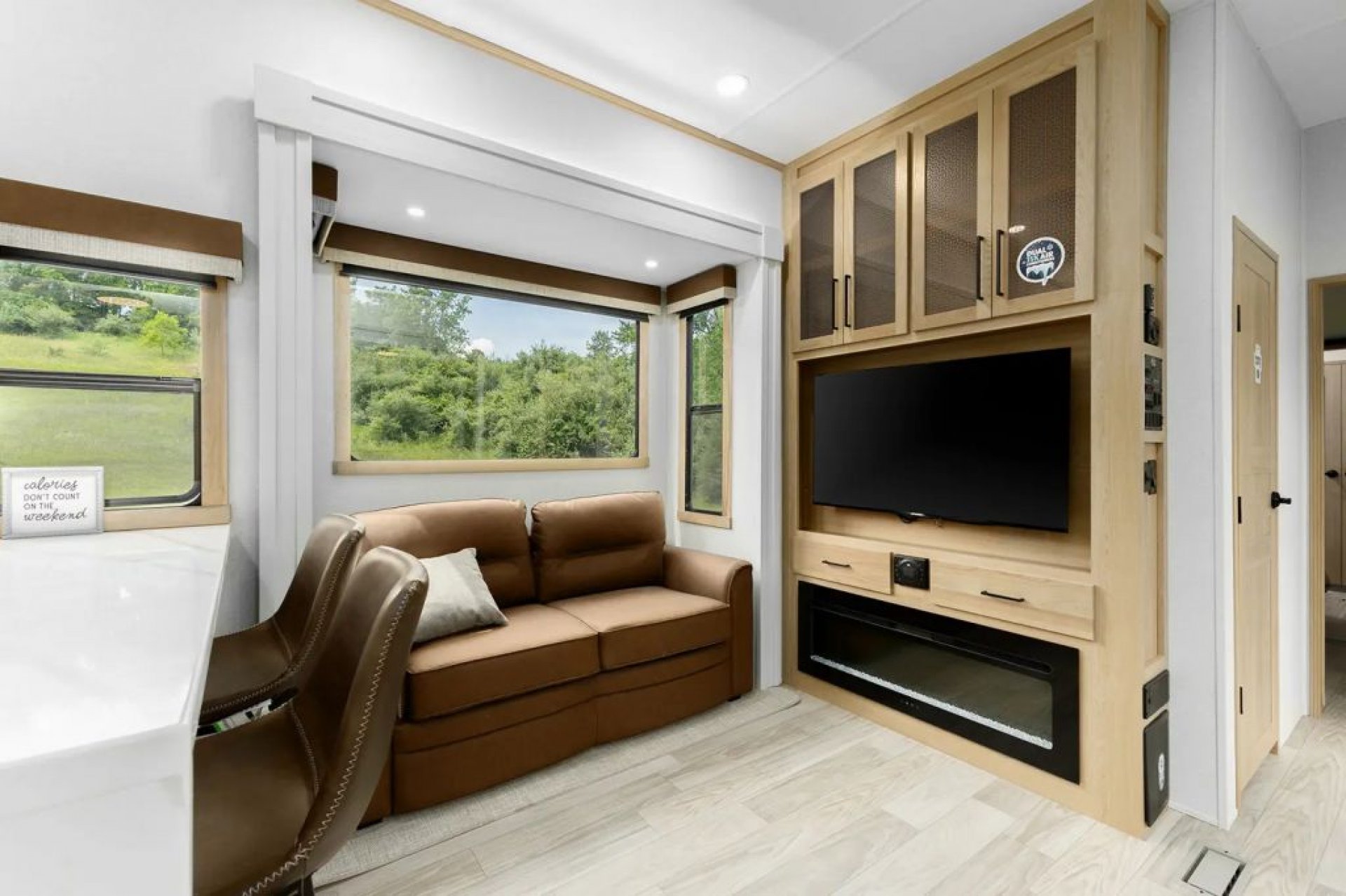 - Living Area: Front-facing great room with opposing slide-outs—one for theater seating and one for the entertainment center with a fireplace—offering panoramic views through extra-large windows.