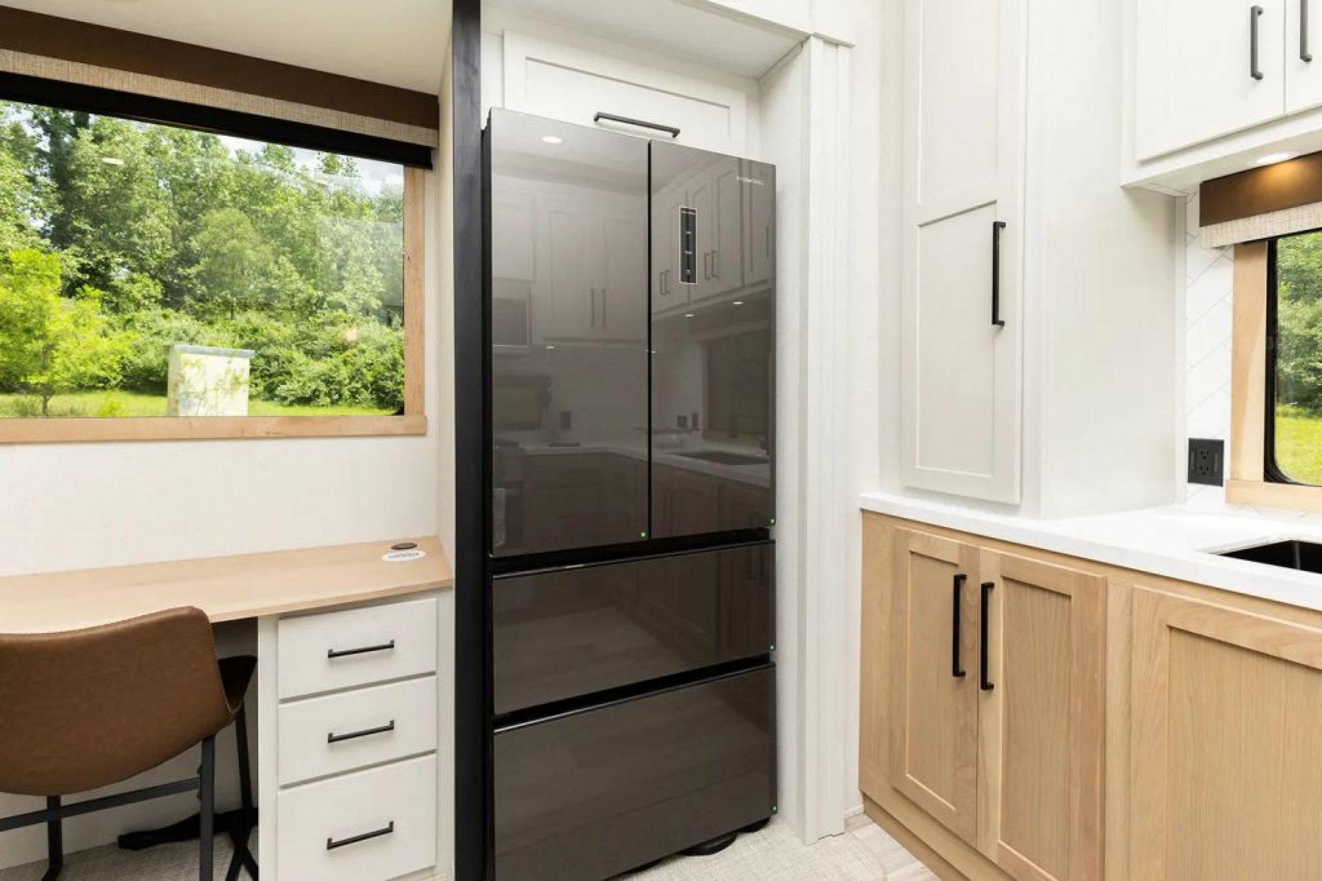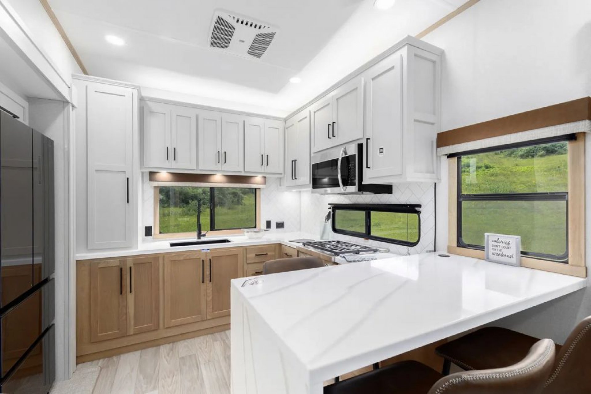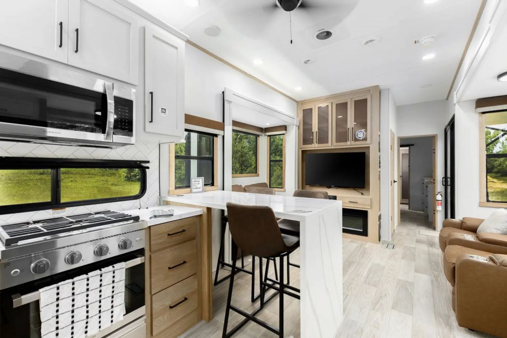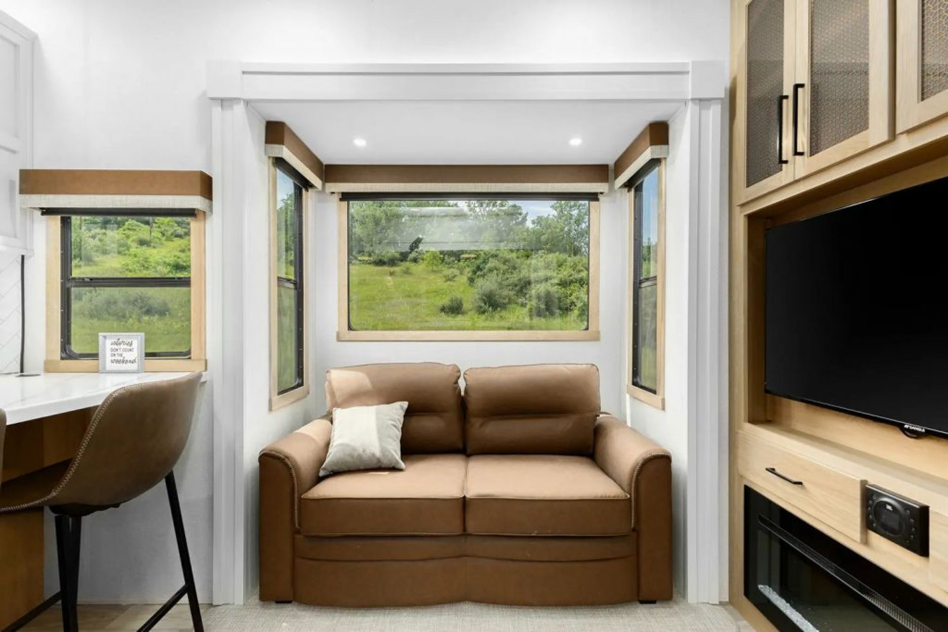 - Living Area: Front-facing great room with opposing slide-outs—one for theater seating and one for the entertainment center with a fireplace—offering panoramic views through extra-large windows.