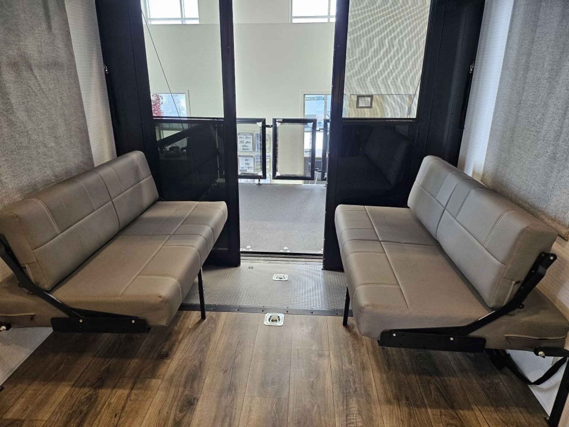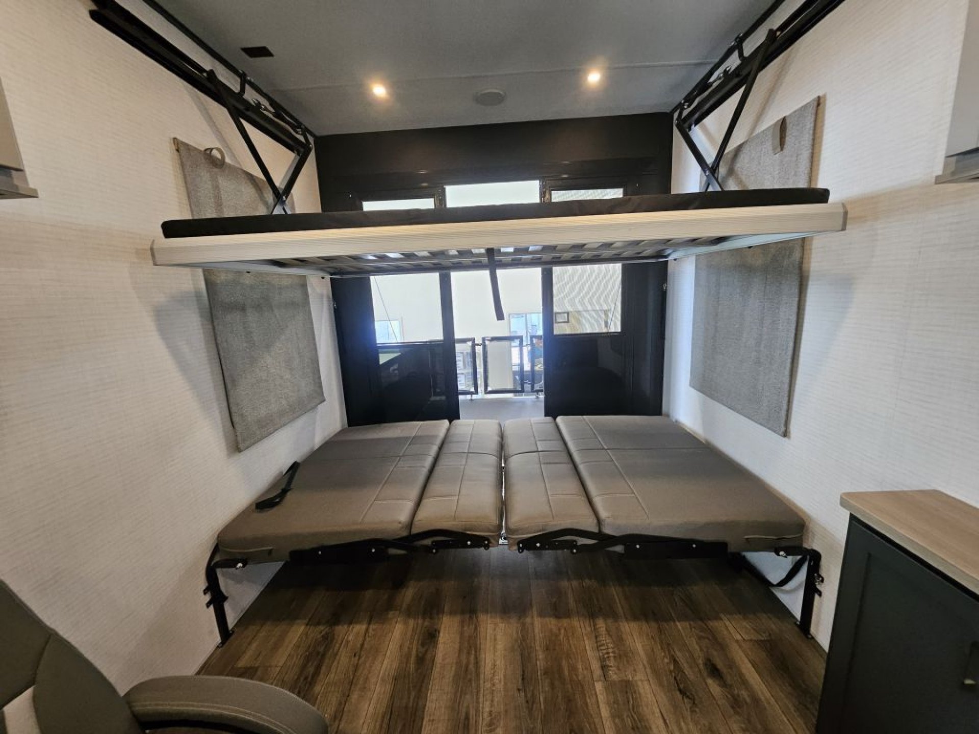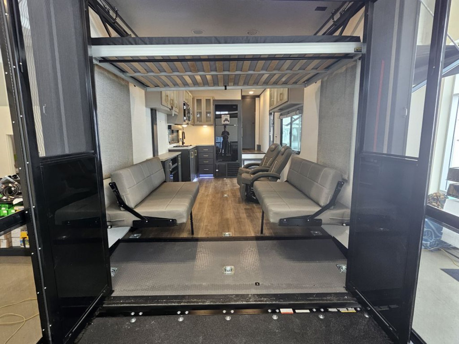 At the rear, the fully functional garage features a heavy-duty ramp door system for loading ATVs, dirt bikes, or side-by-sides (size dependent). Integrated floor tie-downs secure cargo during transit, while the garage easily converts into secondary living or sleeping space once unloaded. Depending on configuration, this area can include fold-up sofas and/or a drop-down bed system, making it ideal for families or riding groups. The ramp may also function as a patio space when equipped with railing kit.