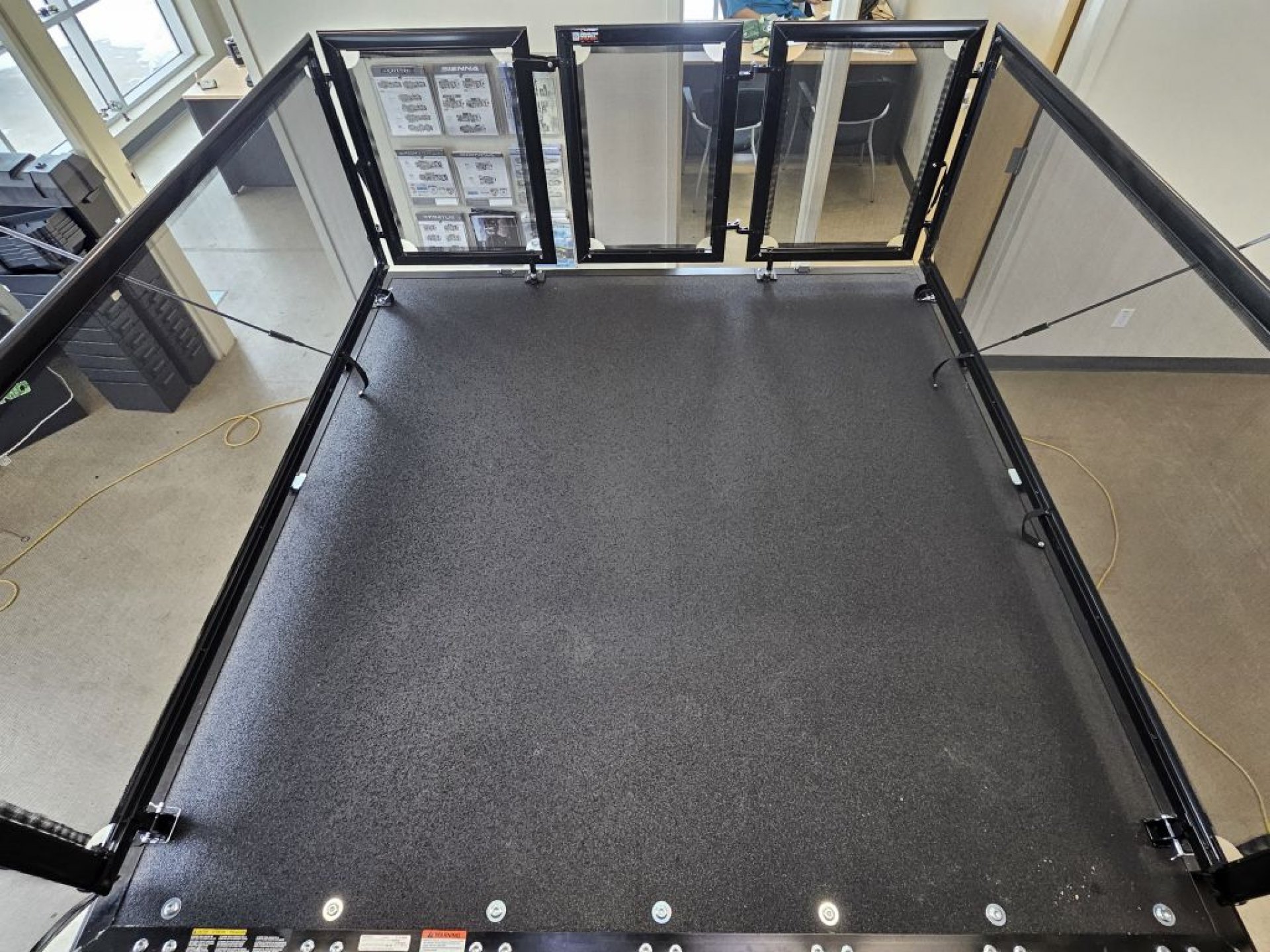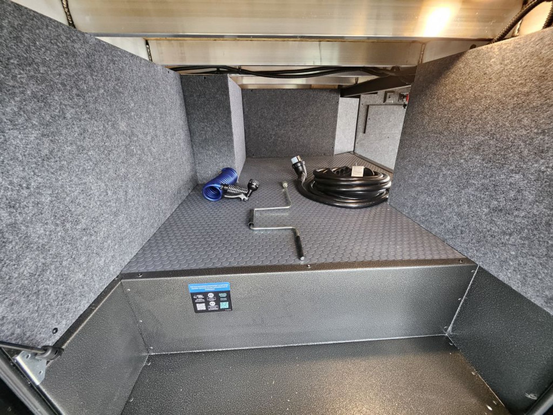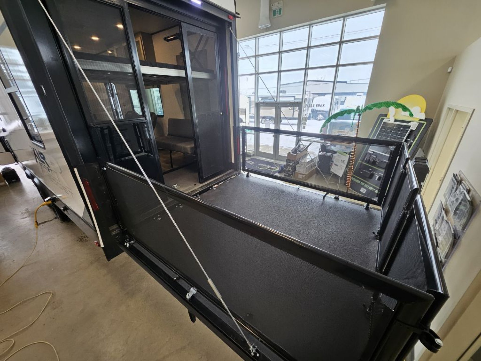 At the rear, the fully functional garage features a heavy-duty ramp door system for loading ATVs, dirt bikes, or side-by-sides (size dependent). Integrated floor tie-downs secure cargo during transit, while the garage easily converts into secondary living or sleeping space once unloaded. Depending on configuration, this area can include fold-up sofas and/or a drop-down bed system, making it ideal for families or riding groups. The ramp may also function as a patio space when equipped with railing kit.