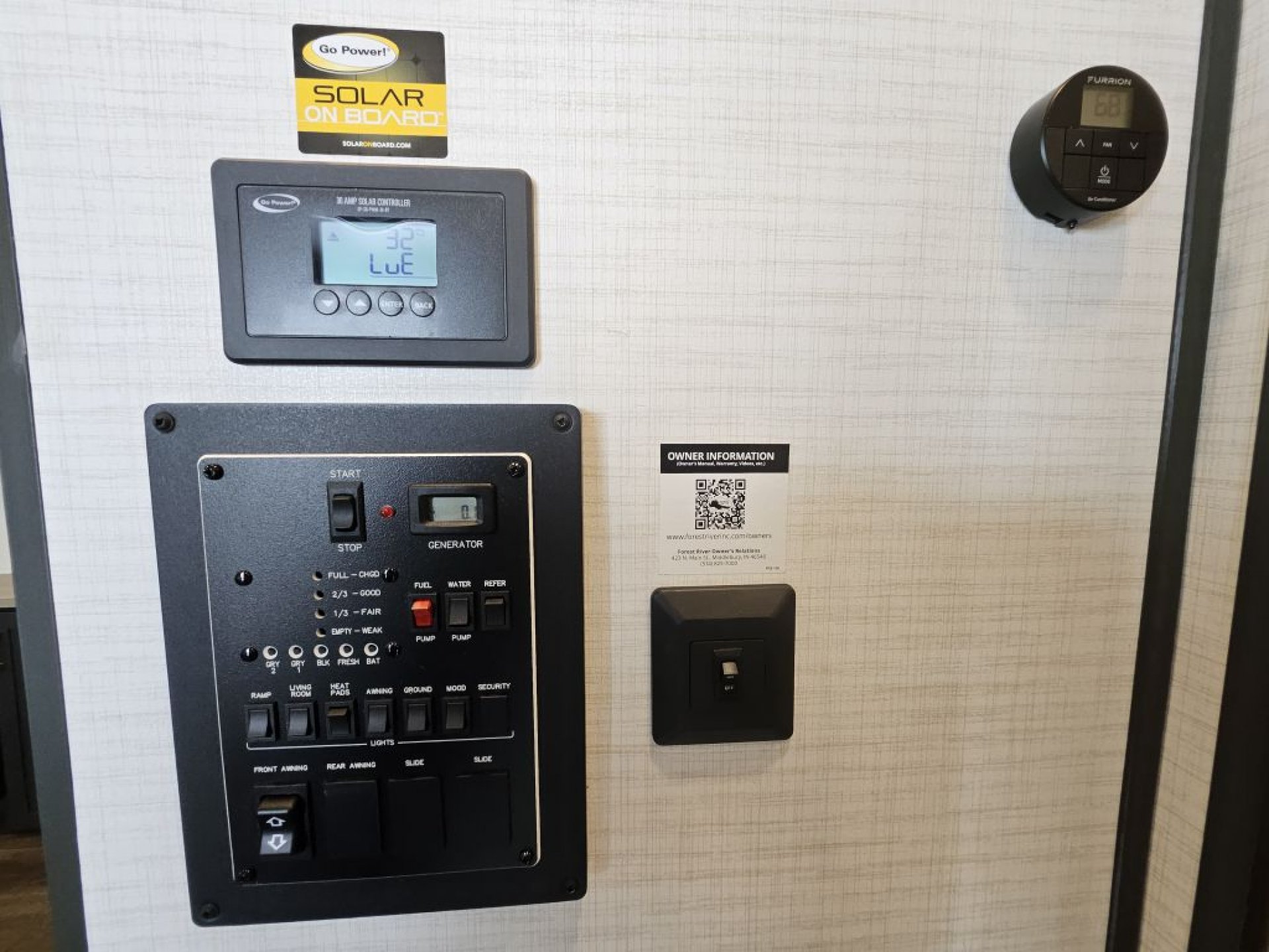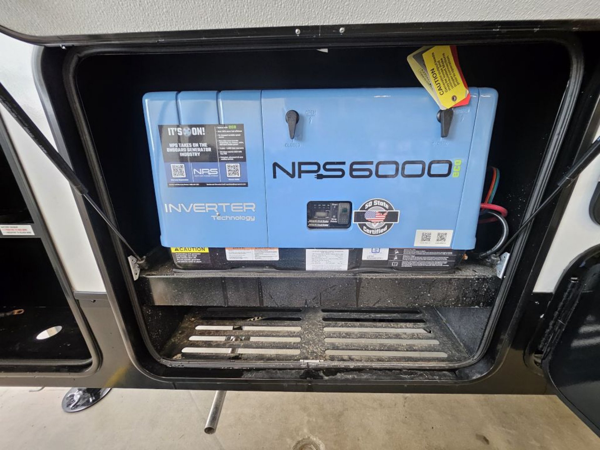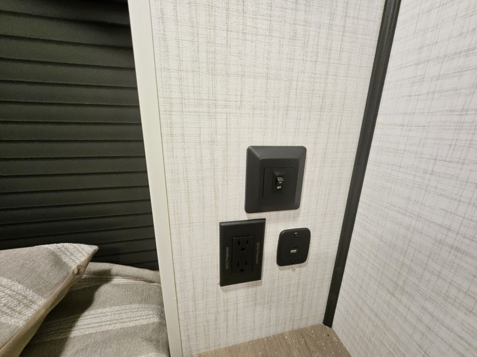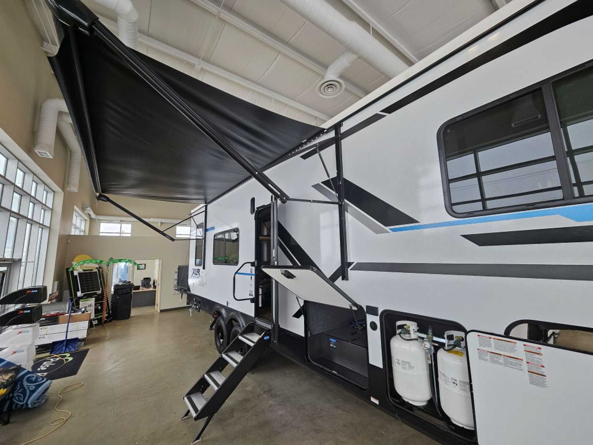 Exterior features enhance campsite usability, including a power awning with LED lighting, exterior speakers, backup camera prep, and solar prep. The enclosed underbelly (where equipped) and high-output A/C system support seasonal versatility. A walkable roof simplifies maintenance and inspection.