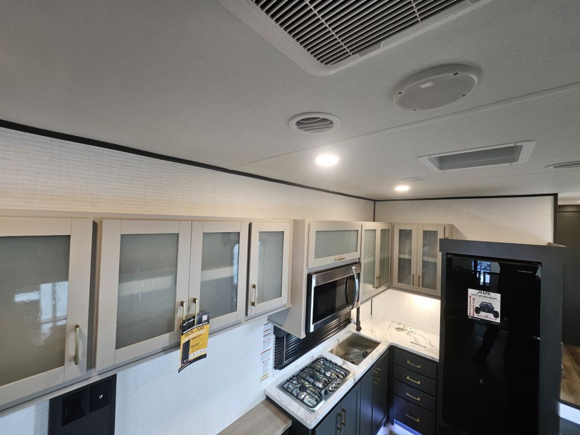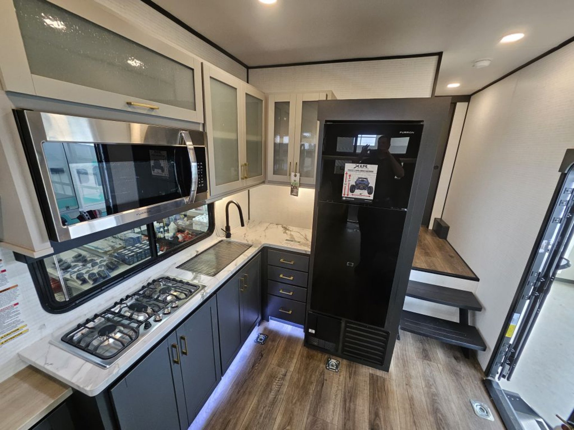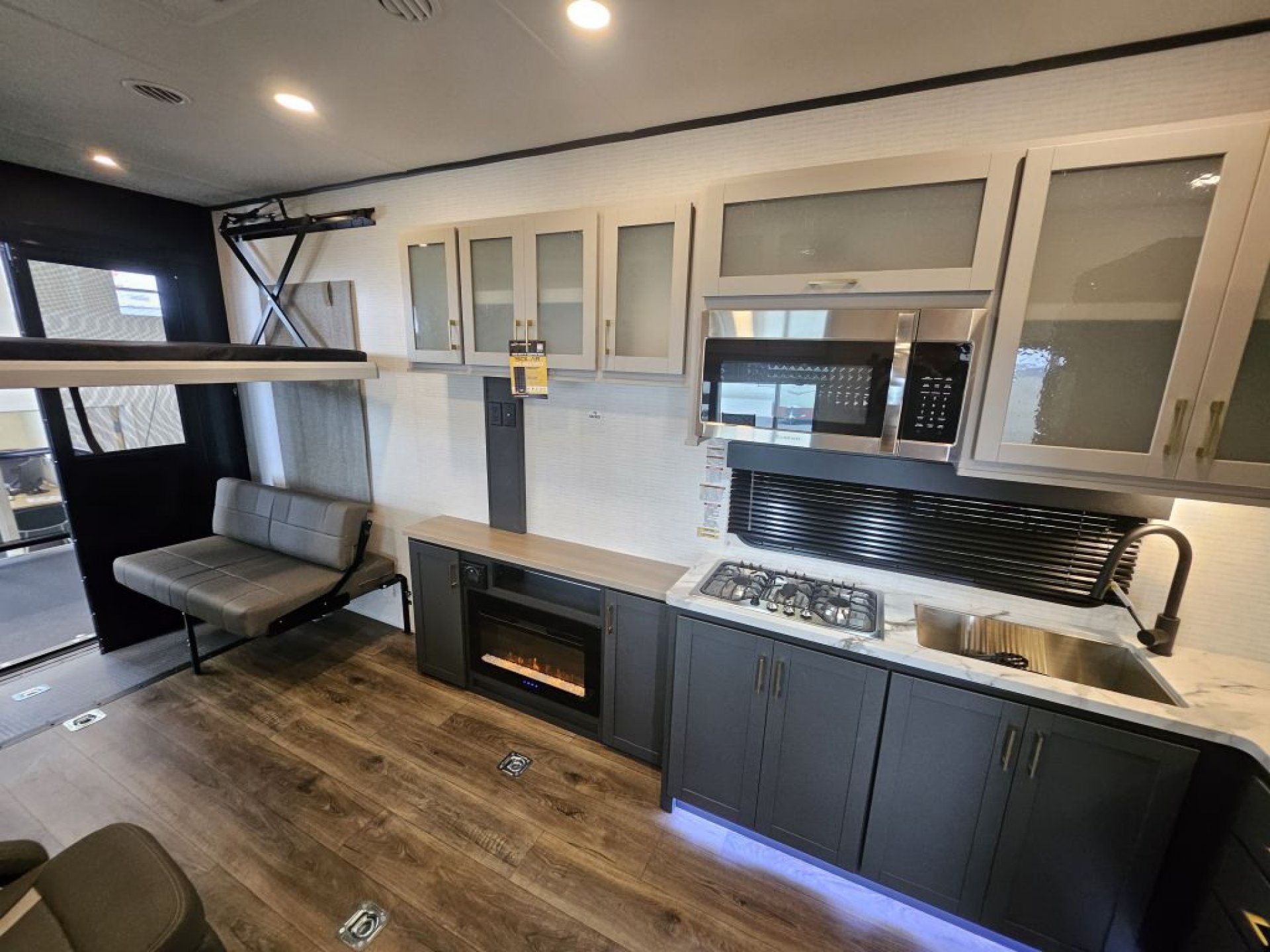 The main living area is positioned forward of the garage and offers a functional, open-concept layout. The kitchen includes a residential-style refrigerator, three-burner cooktop with oven, microwave, stainless sink, solid-surface style countertops (package dependent), and ample cabinetry for extended trips. The living space is entertainment-ready with TV backer and connectivity options, along with comfortable seating positioned for visibility and flow.