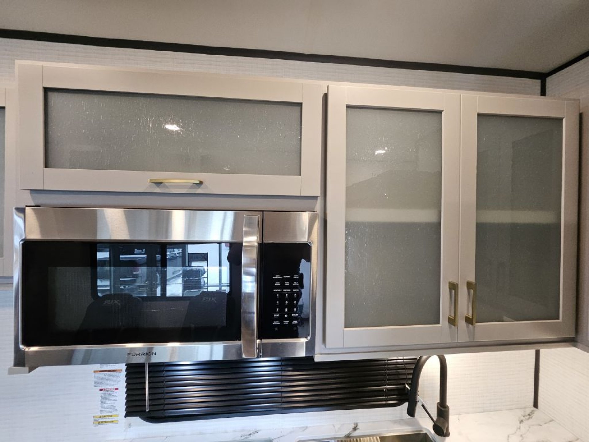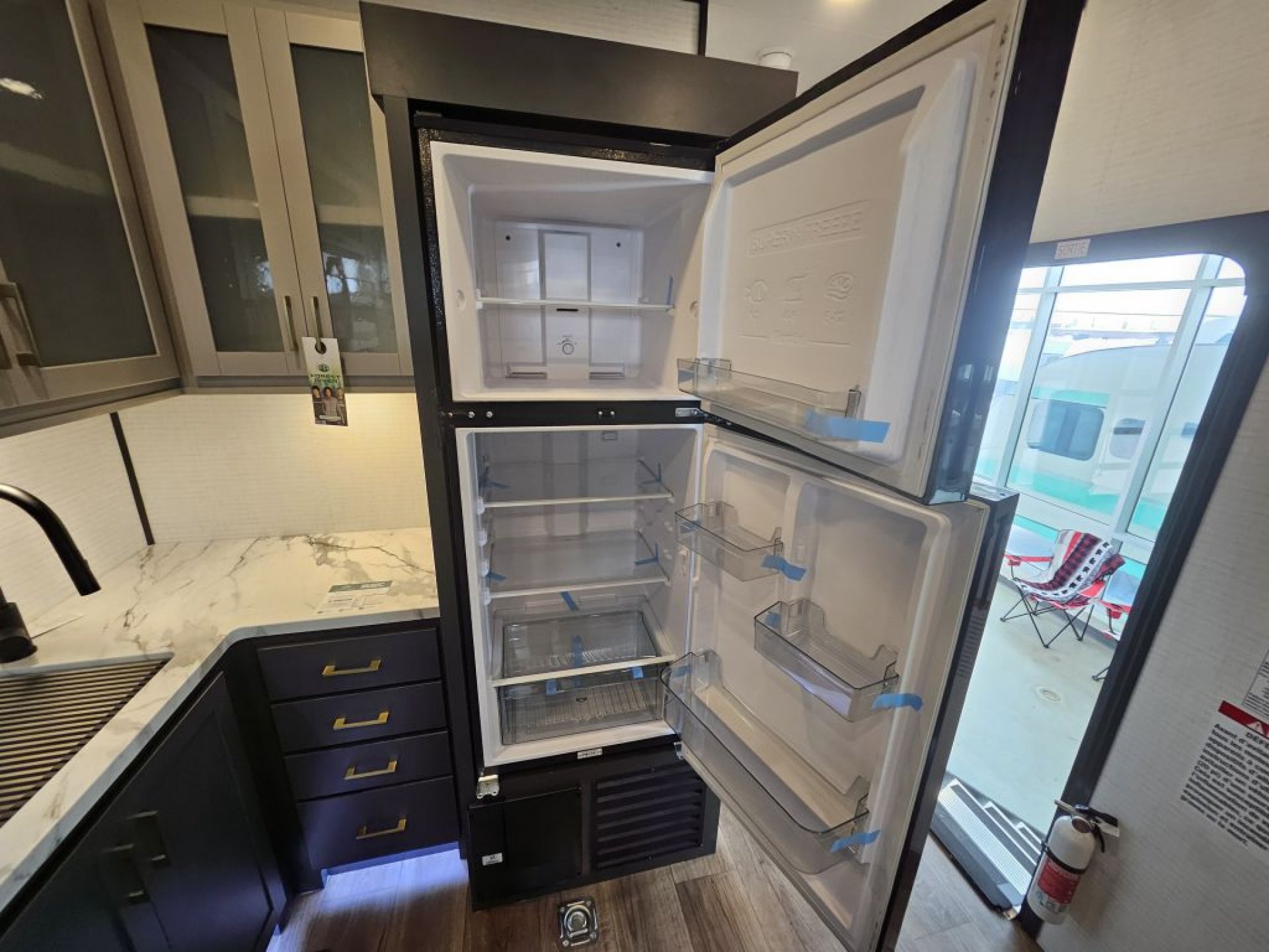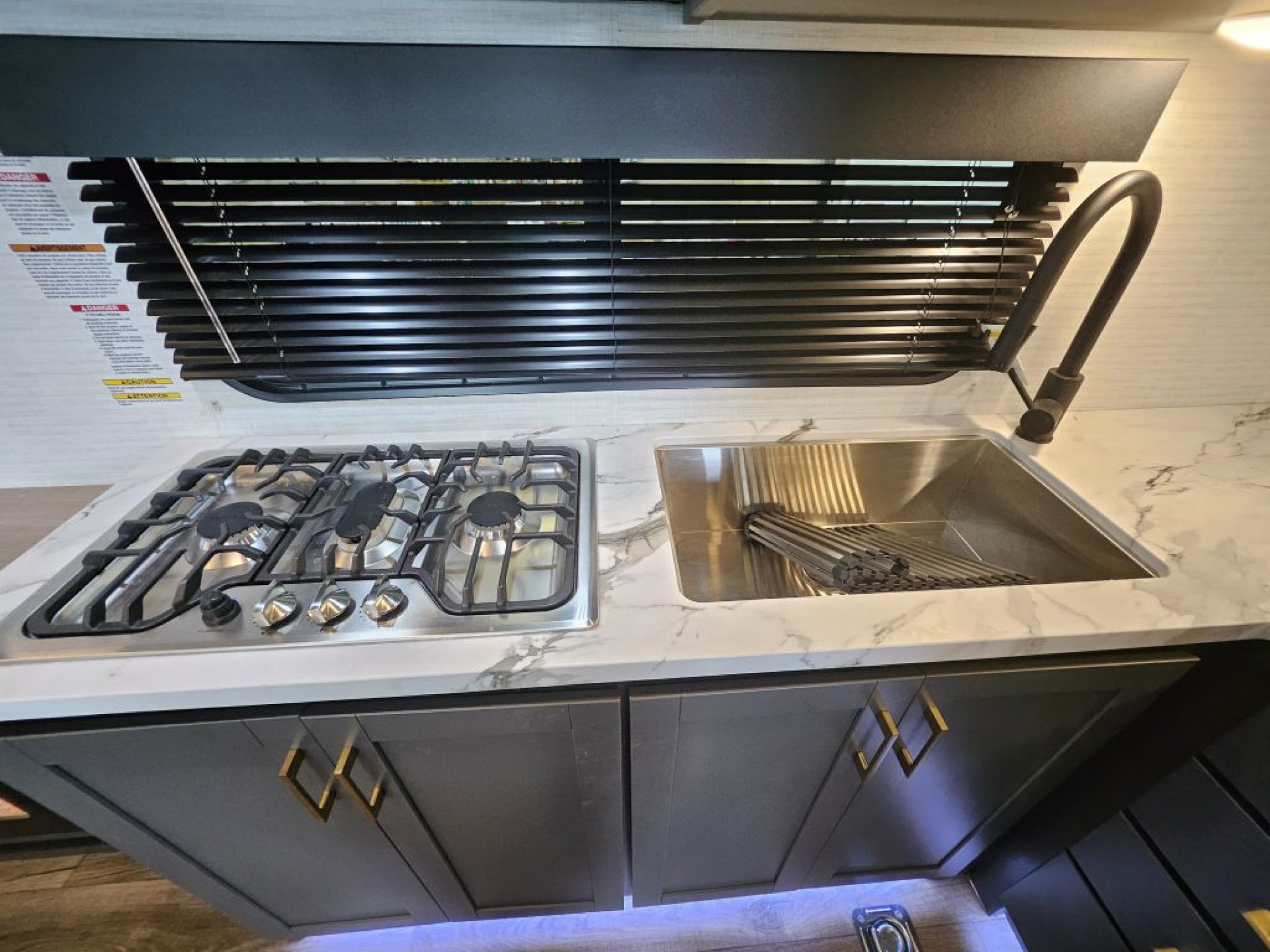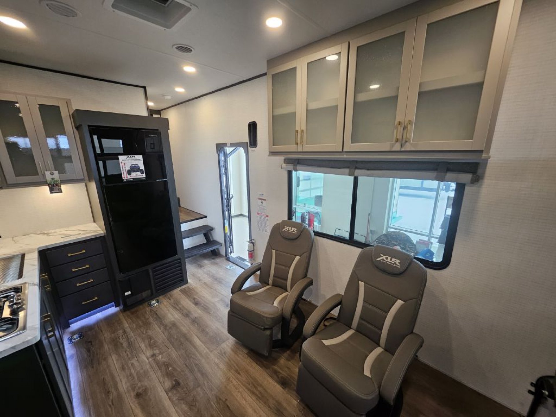 The main living area is positioned forward of the garage and offers a functional, open-concept layout. The kitchen includes a residential-style refrigerator, three-burner cooktop with oven, microwave, stainless sink, solid-surface style countertops (package dependent), and ample cabinetry for extended trips. The living space is entertainment-ready with TV backer and connectivity options, along with comfortable seating positioned for visibility and flow.