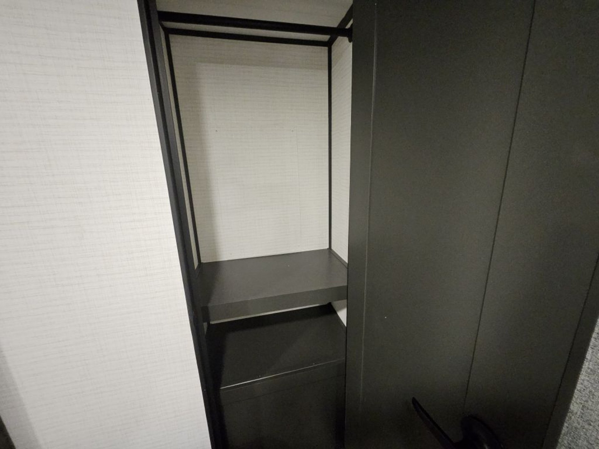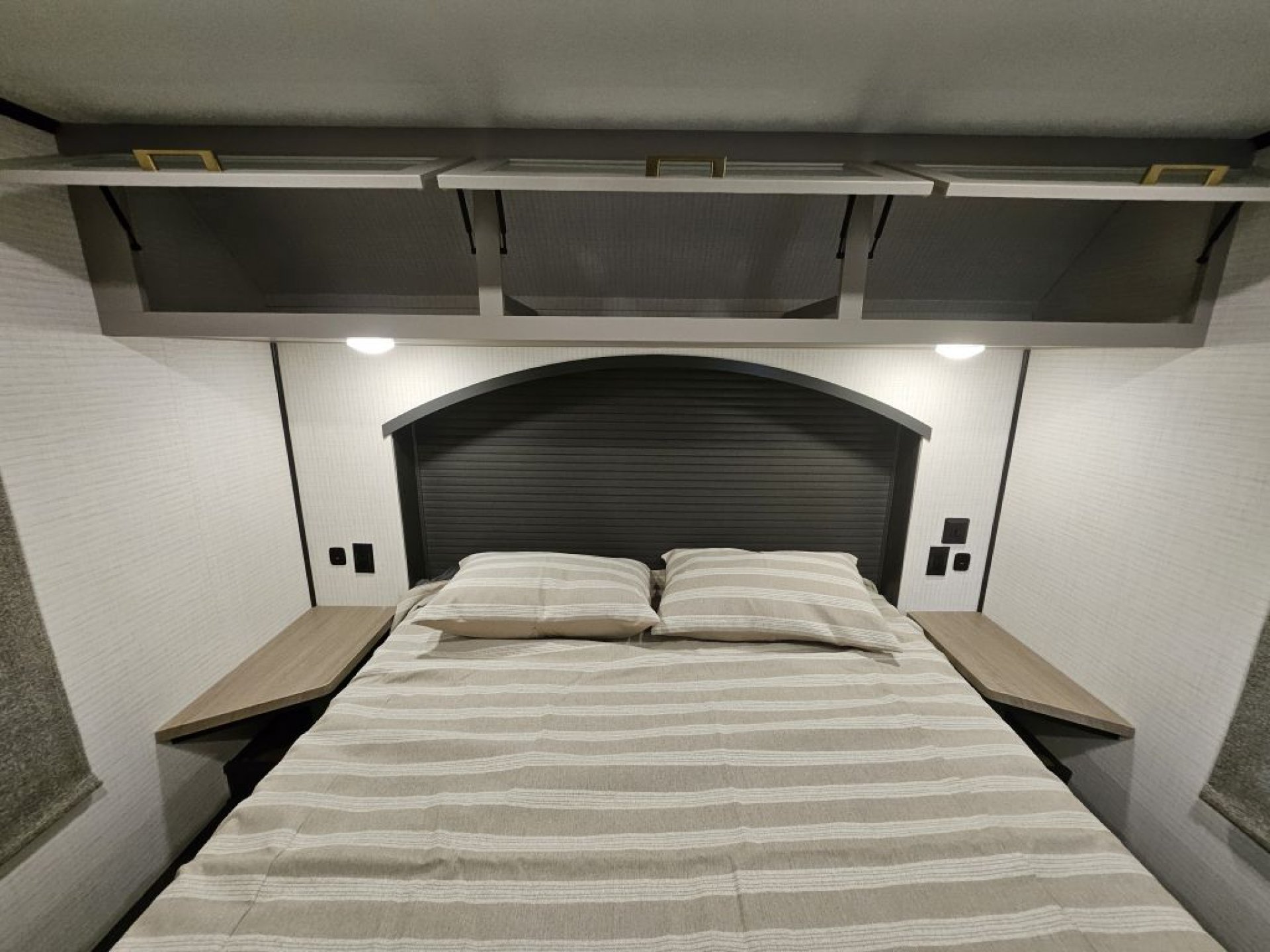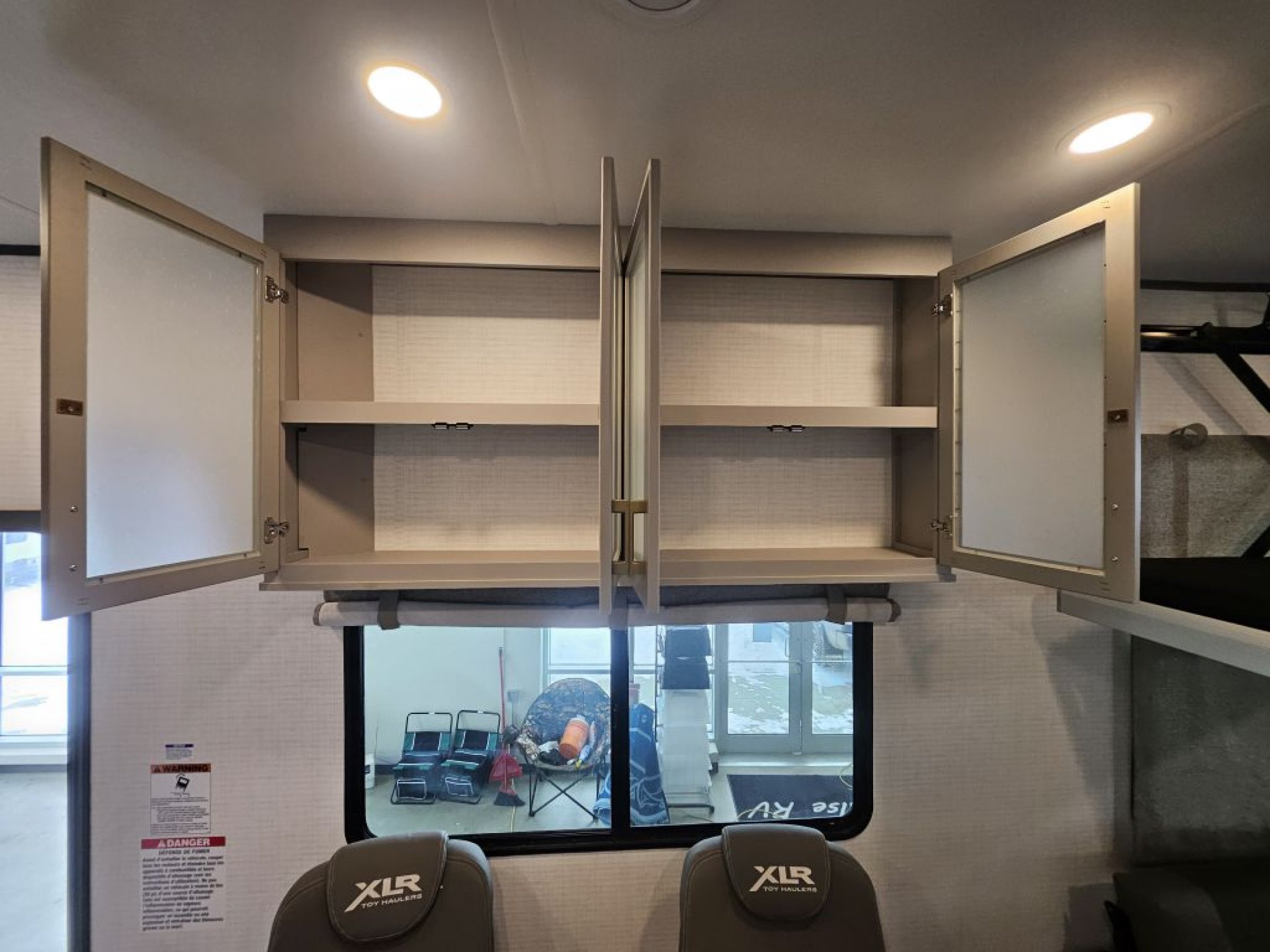 Up front, the private queen bedroom provides separation from both the garage and living area. Dual wardrobes and overhead cabinets maximize storage, and privacy doors allow for a true dedicated sleeping space.