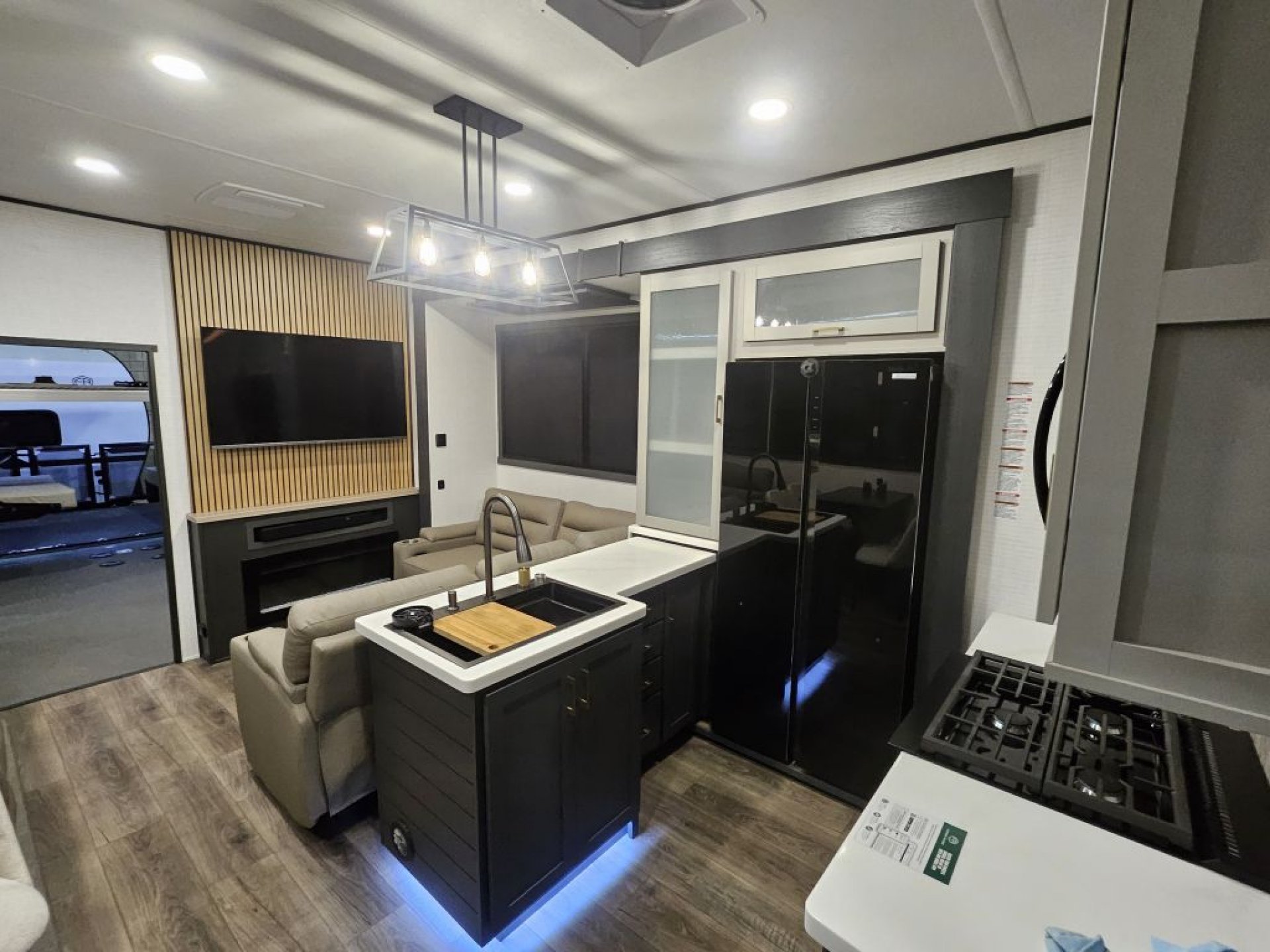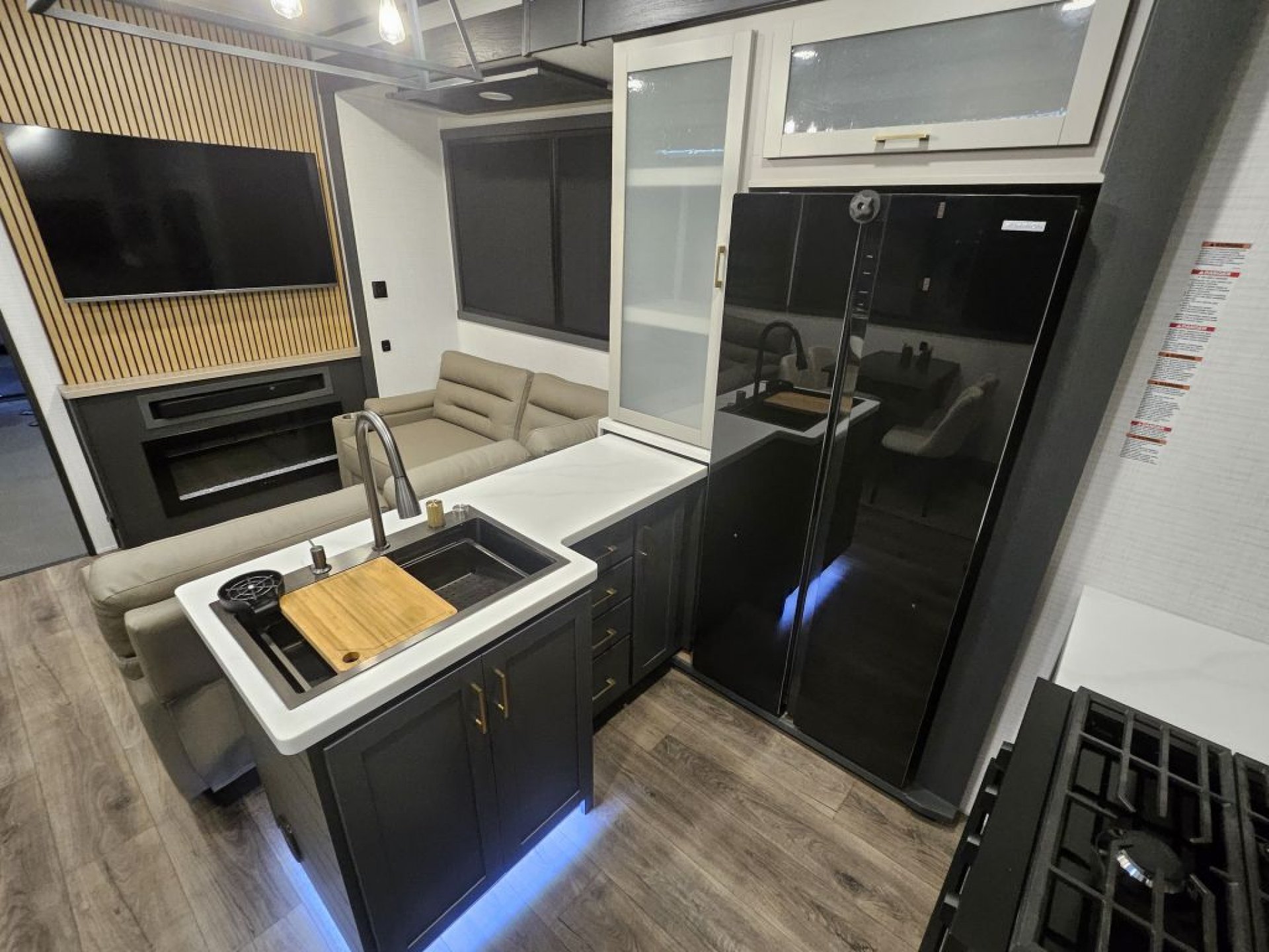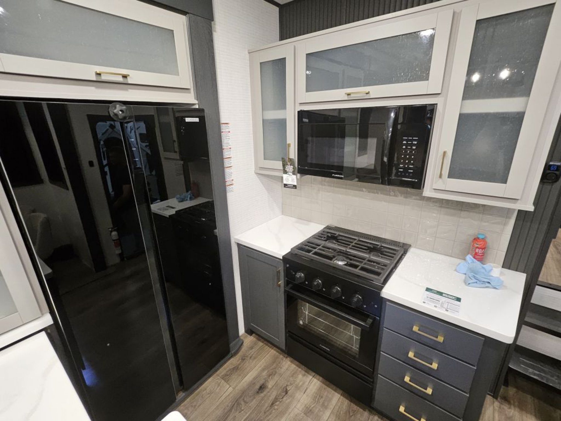 • Chef’s Kitchen: Anchored by diamond solid-surface countertops, a 16 cu. ft. 12V refrigerator, and a 24" oven with a cast-iron cooktop.
