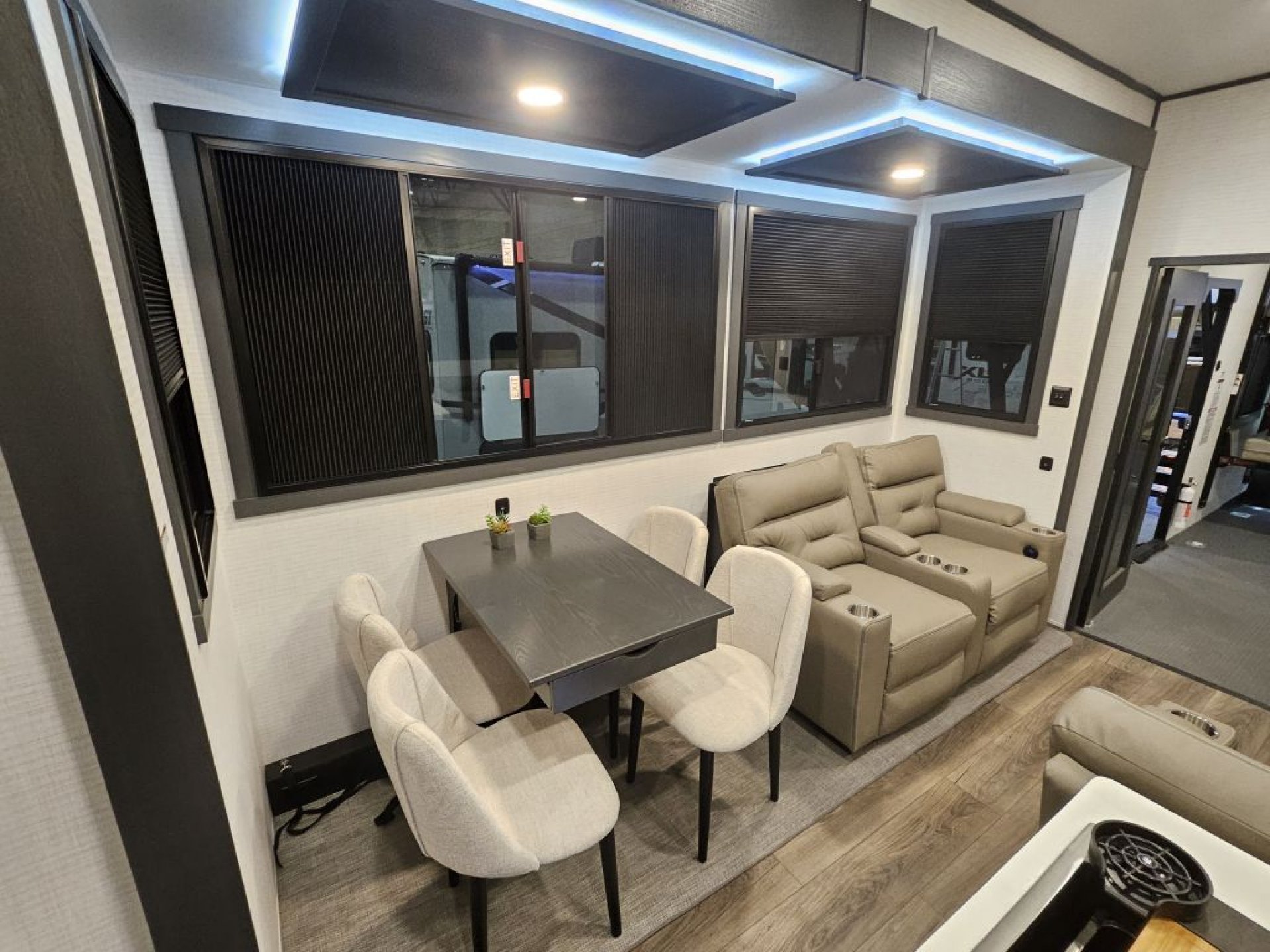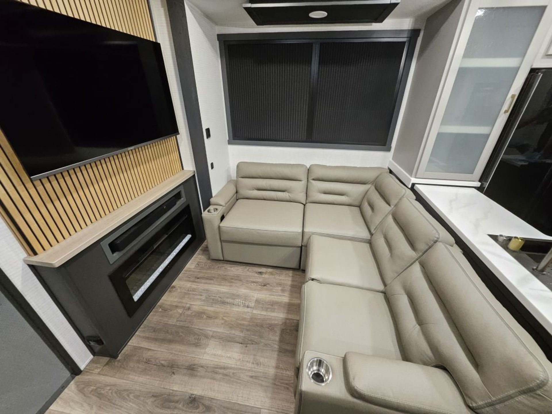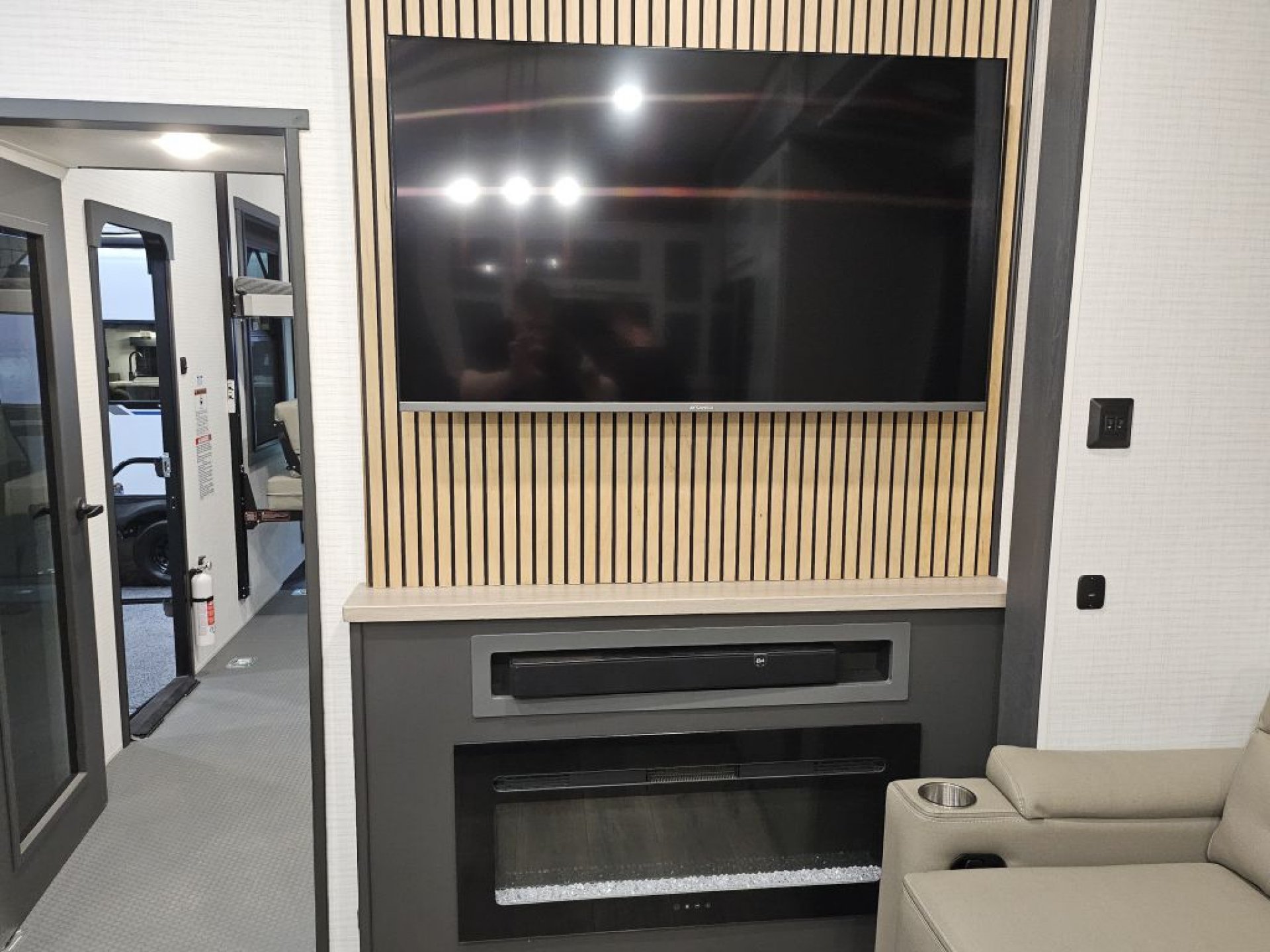 • Residential Living: The central living area features theater seating, an electric fireplace, and a large LED TV, separated from the garage by glass sliding doors.