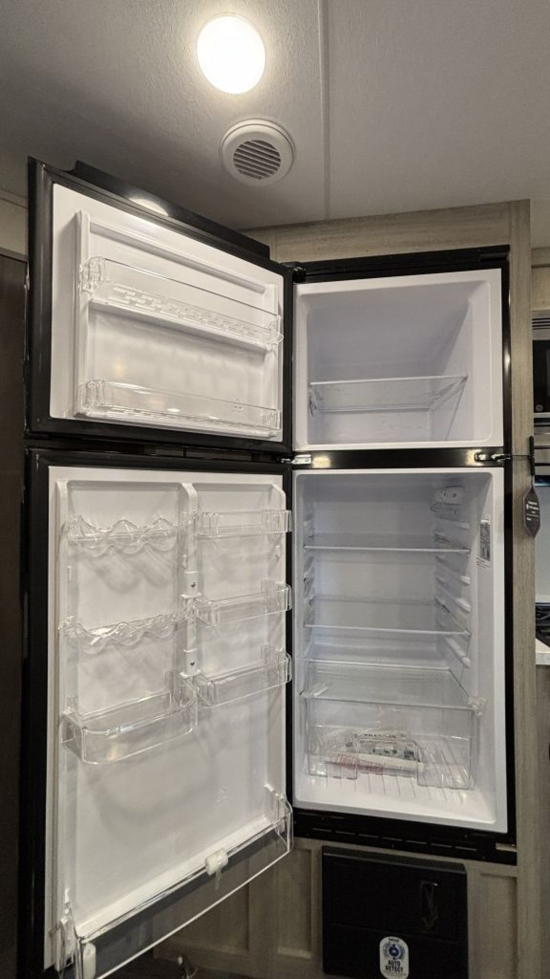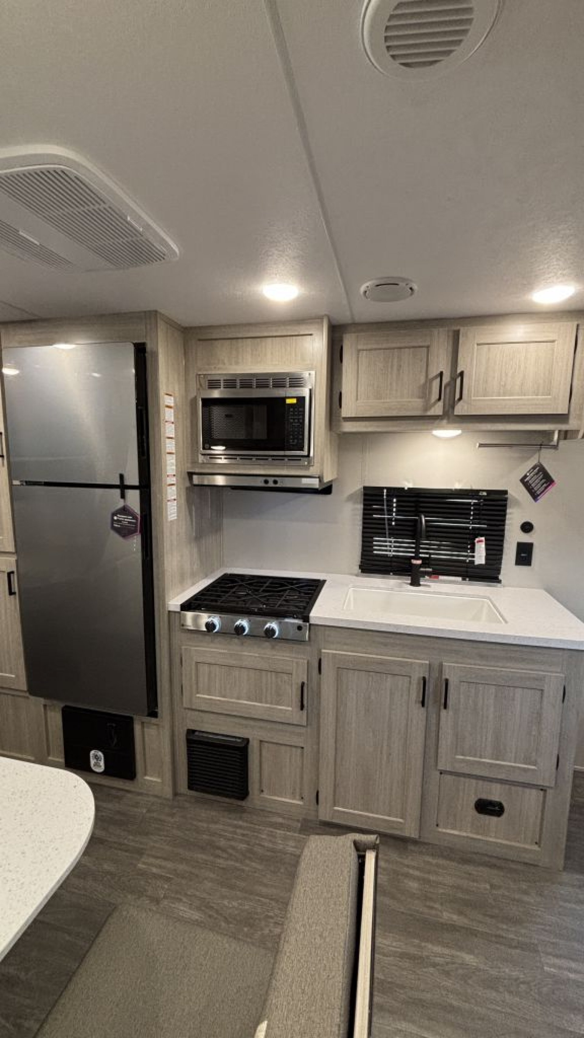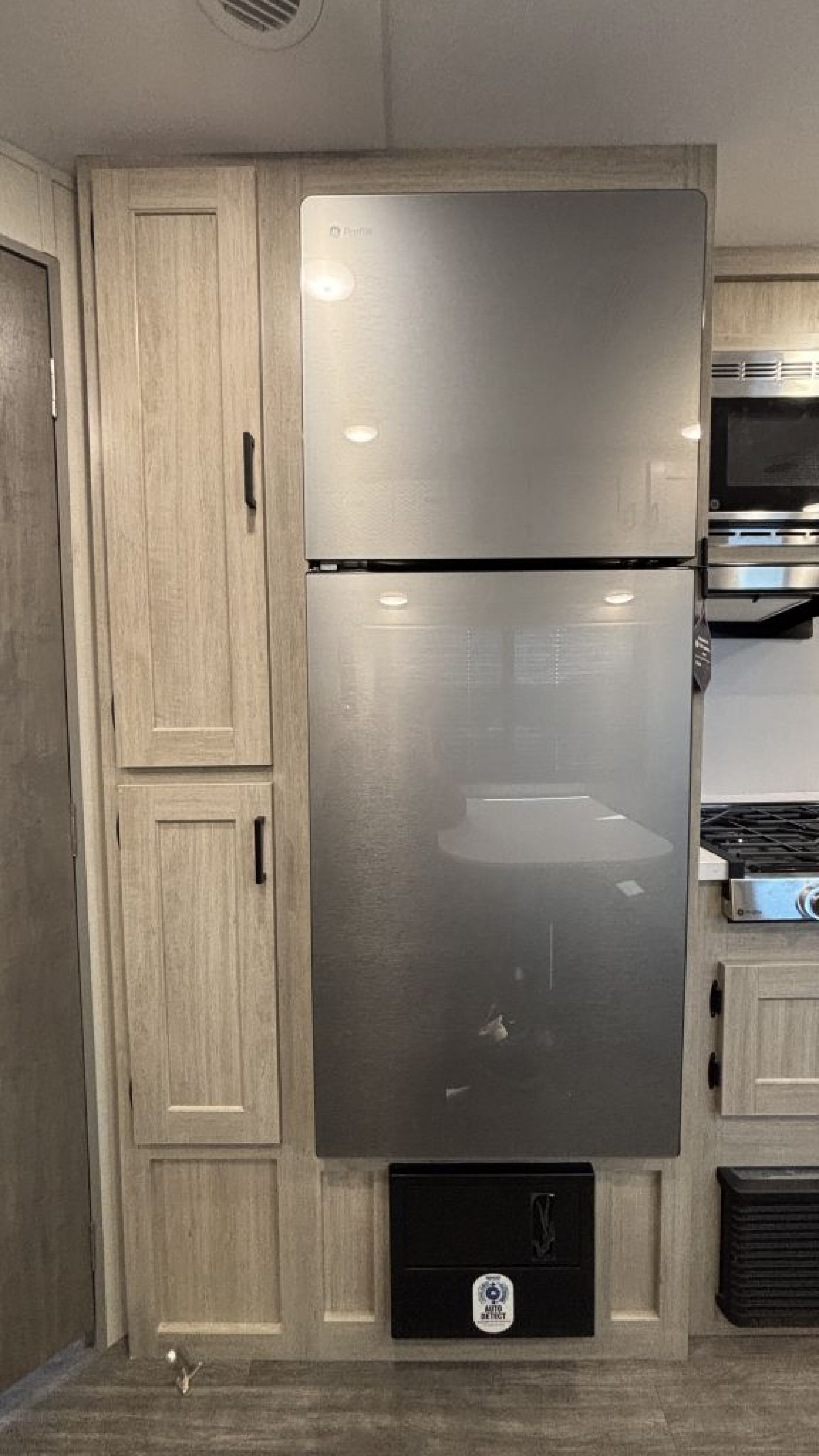 • Kitchen: Well-equipped with a 3-burner cooktop, stainless steel sink, 10.7 cu. ft. 12V refrigerator, microwave, and pantry for meal prep.