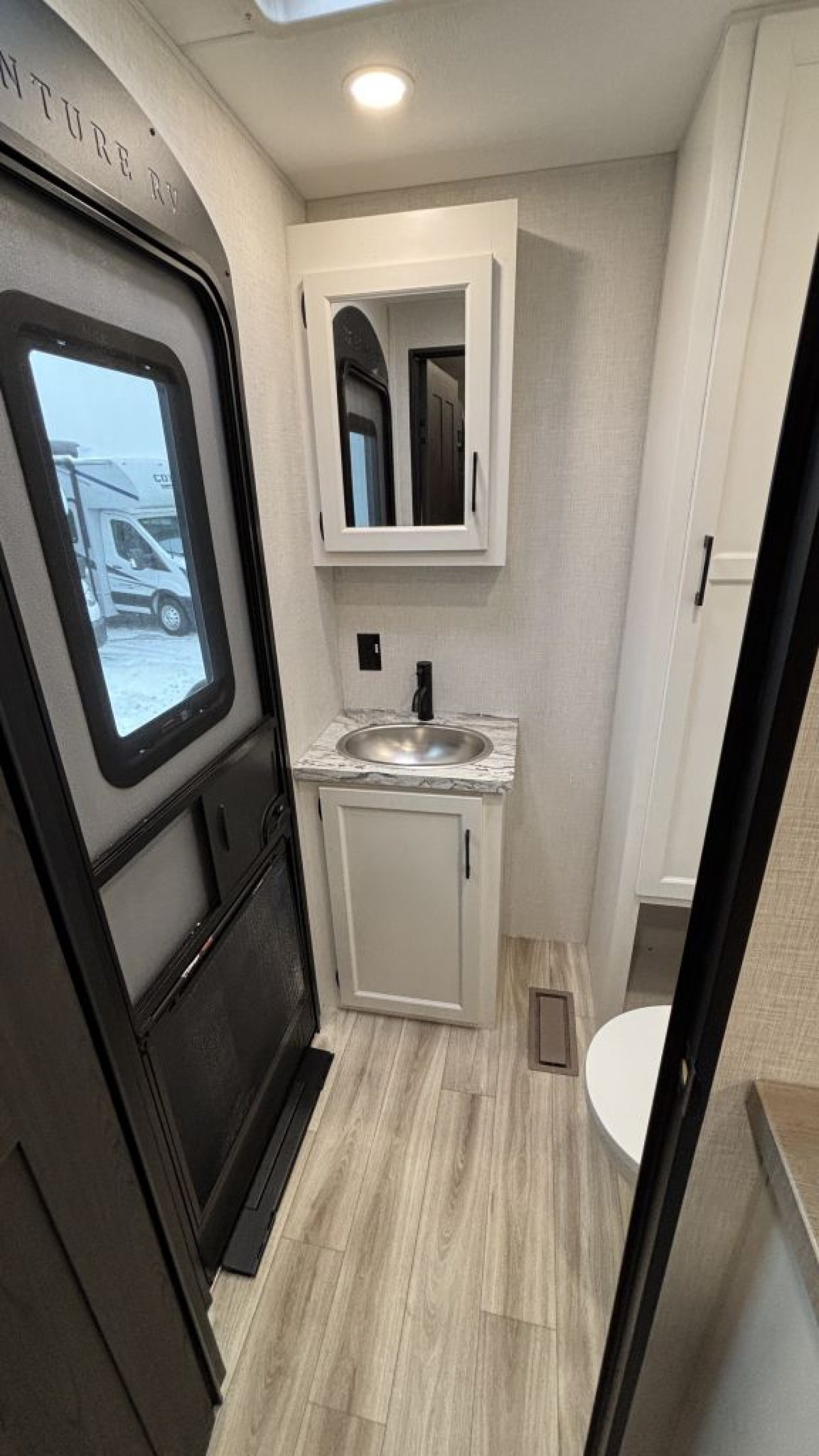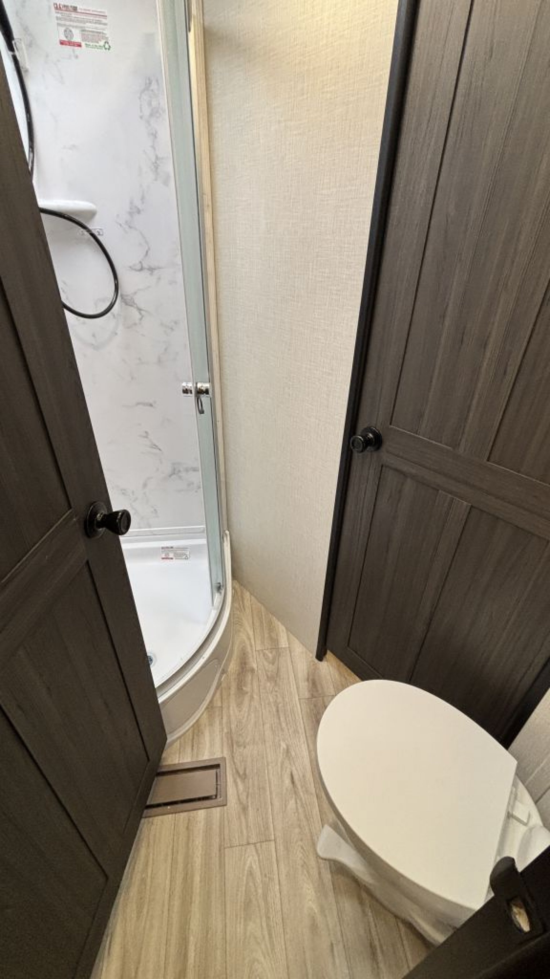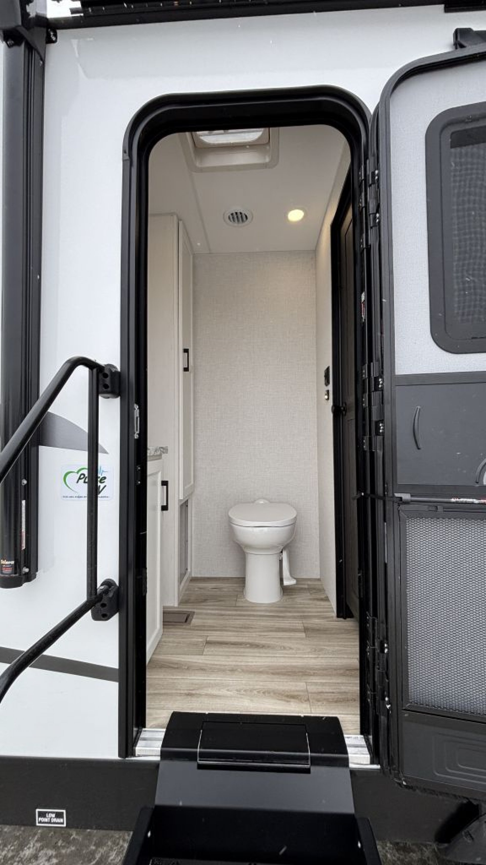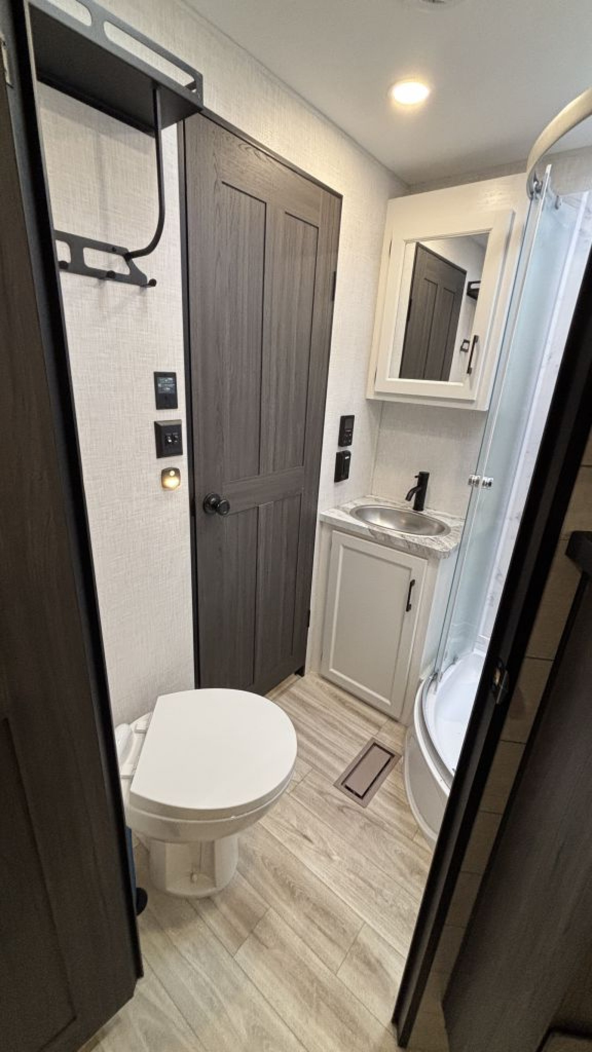 One of the 333VIK’s smartest features is the second bathroom. Located off the bunkhouse, it features a toilet, sink, and its own direct exterior door. This allows guests or kids to use the restroom from the campfire area without trekking through the main living space.