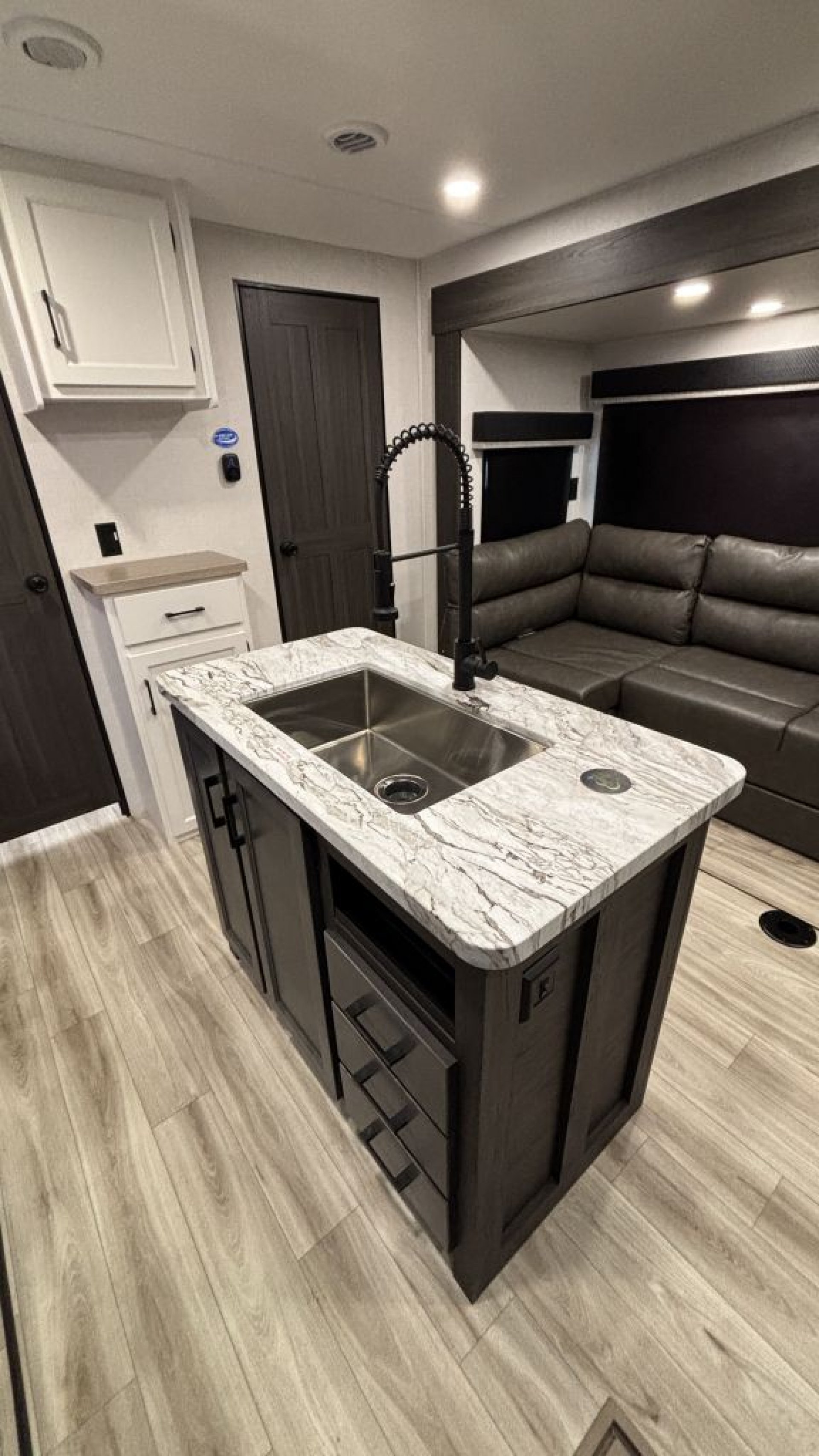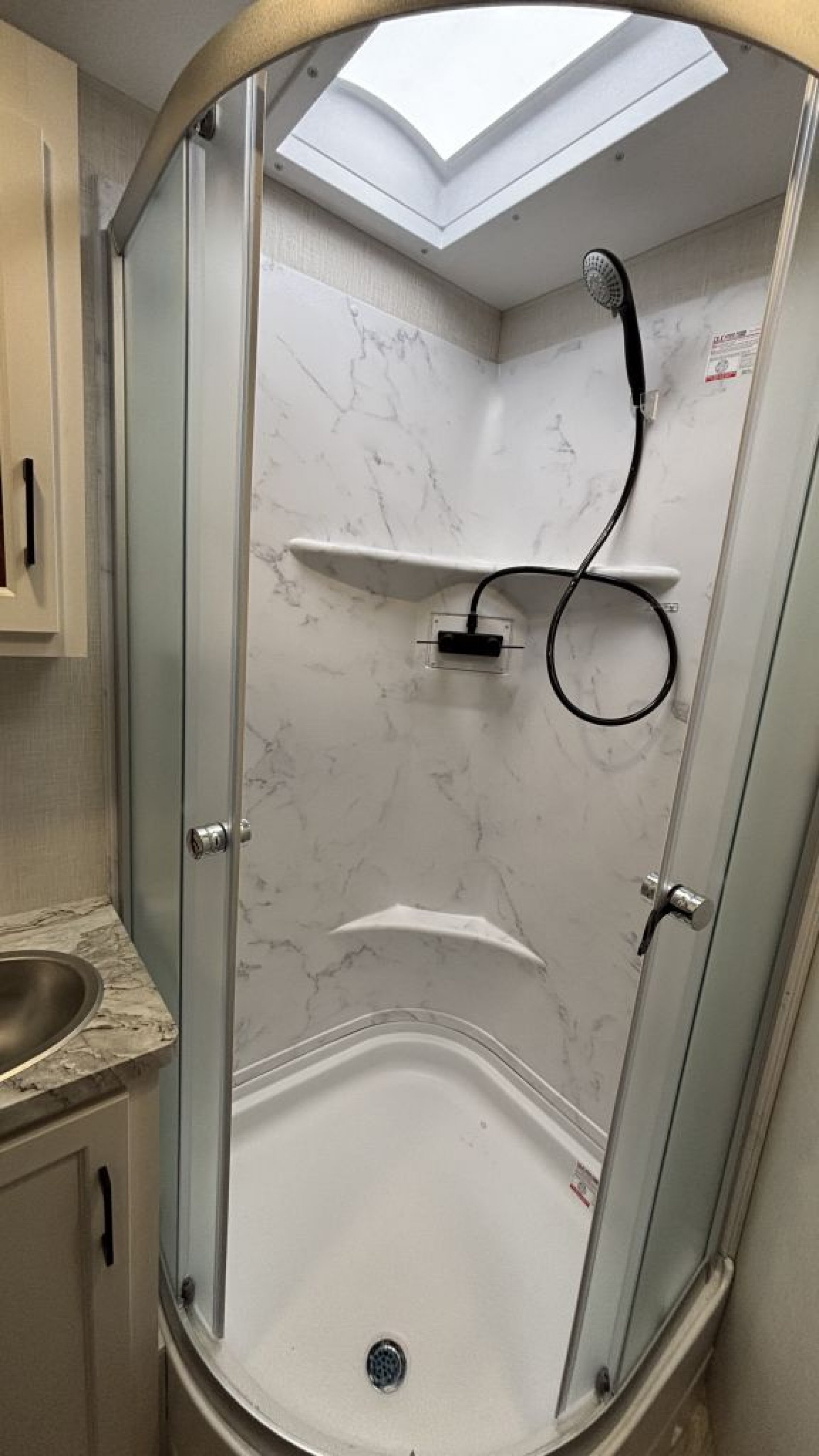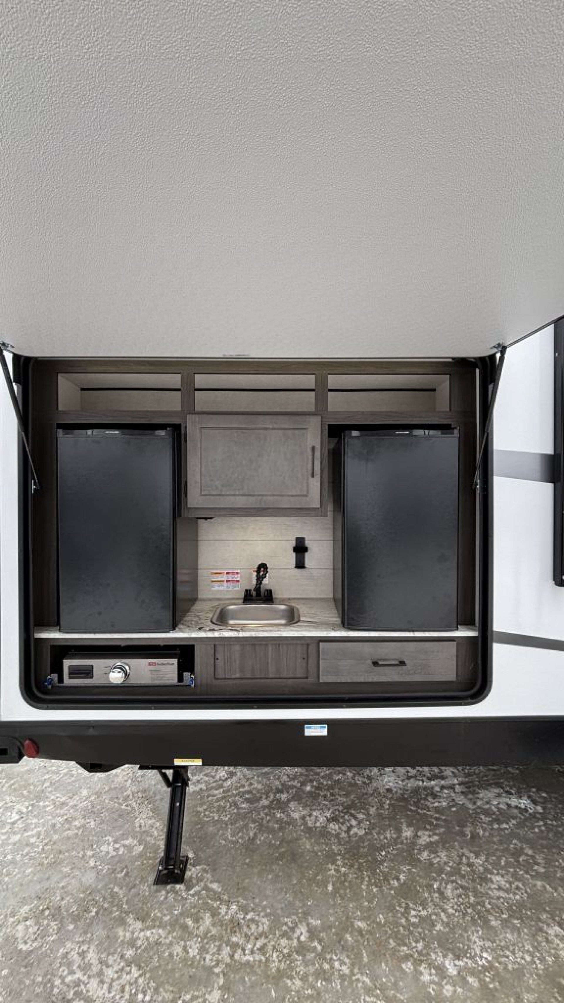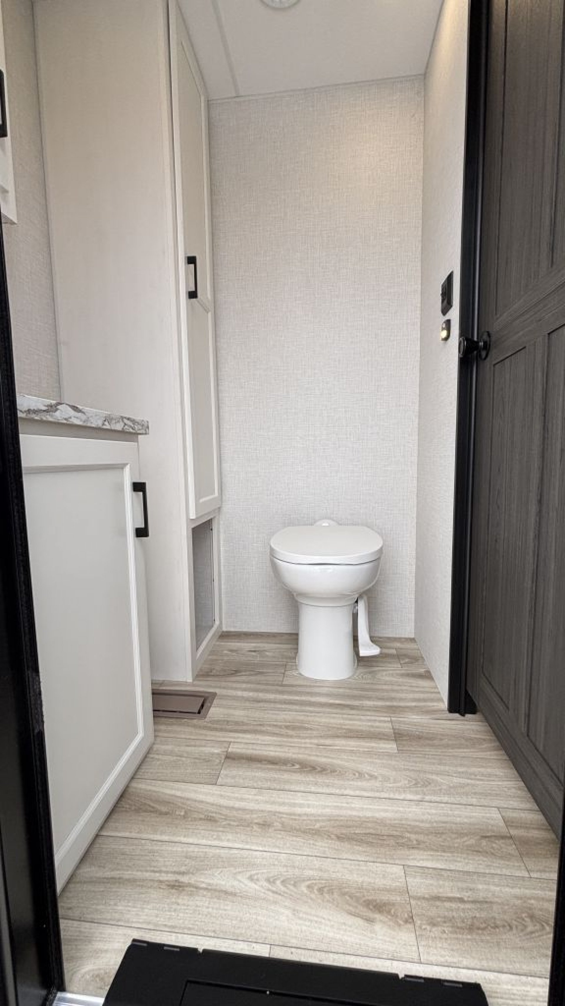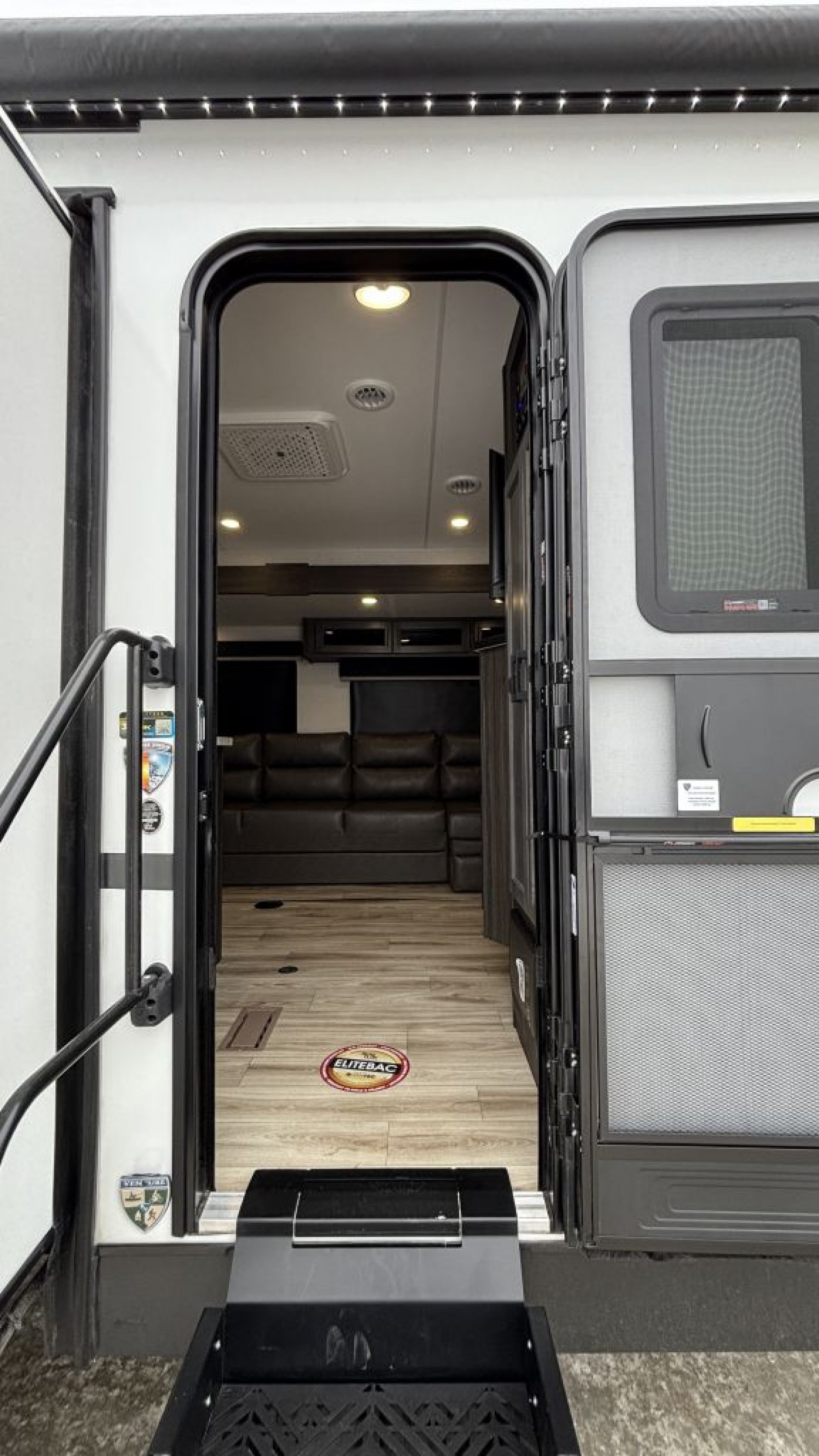 One of the 333VIK’s smartest features is the second bathroom. Located off the bunkhouse, it features a toilet, sink, and its own direct exterior door. This allows guests or kids to use the restroom from the campfire area without trekking through the main living space.