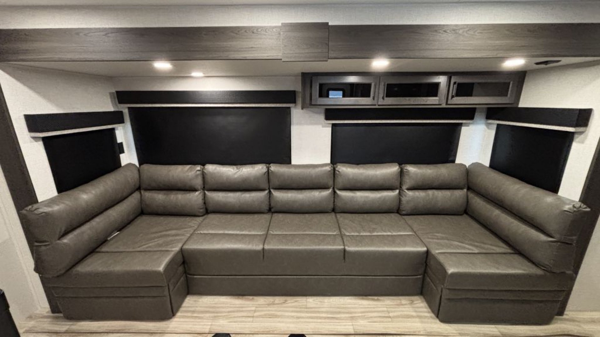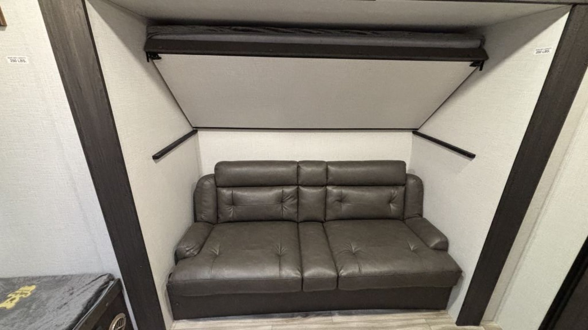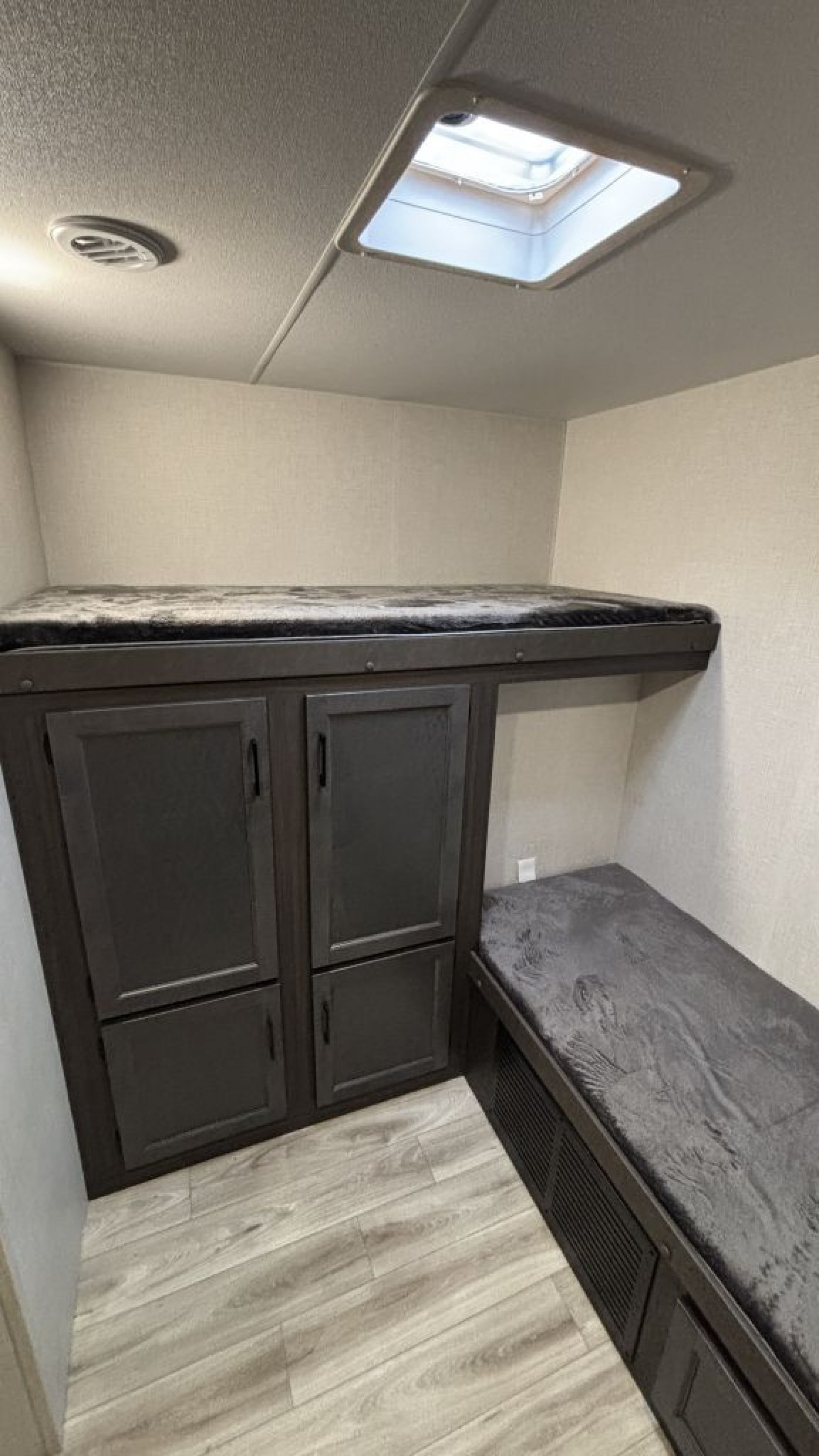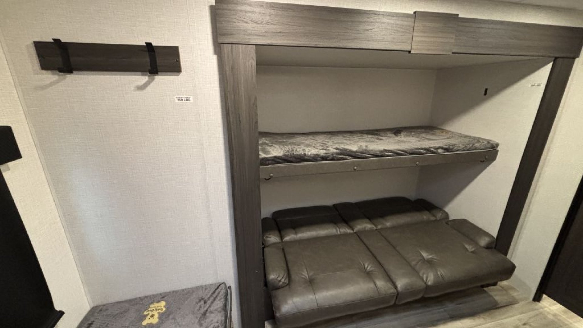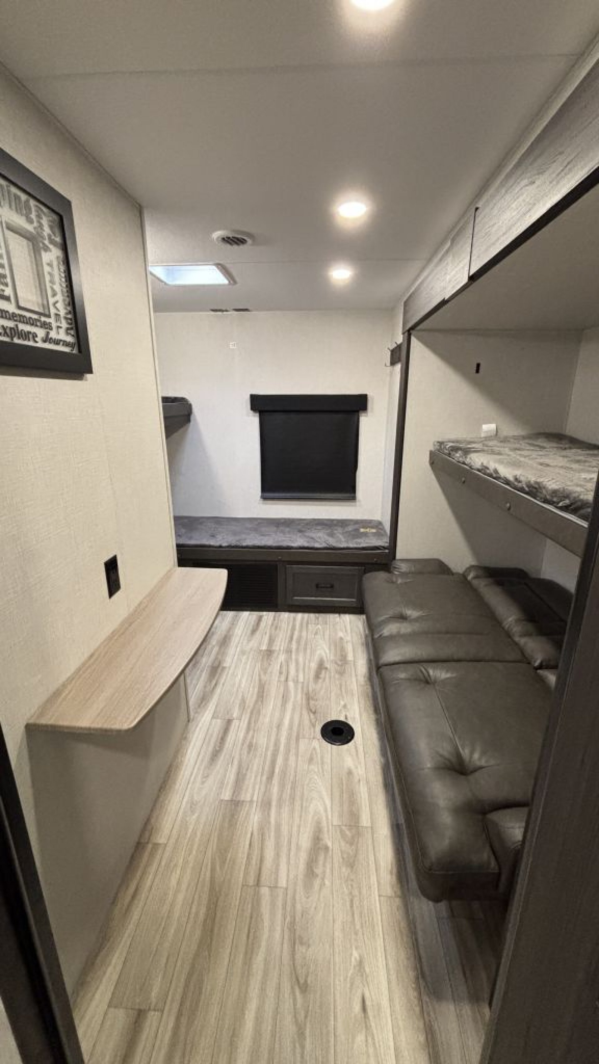 The "Kid Zone" Bunkhouse: A private rear room with a slide-out that includes a flip-up sofa, two bunks, and a built-in desk for homework or gaming.
