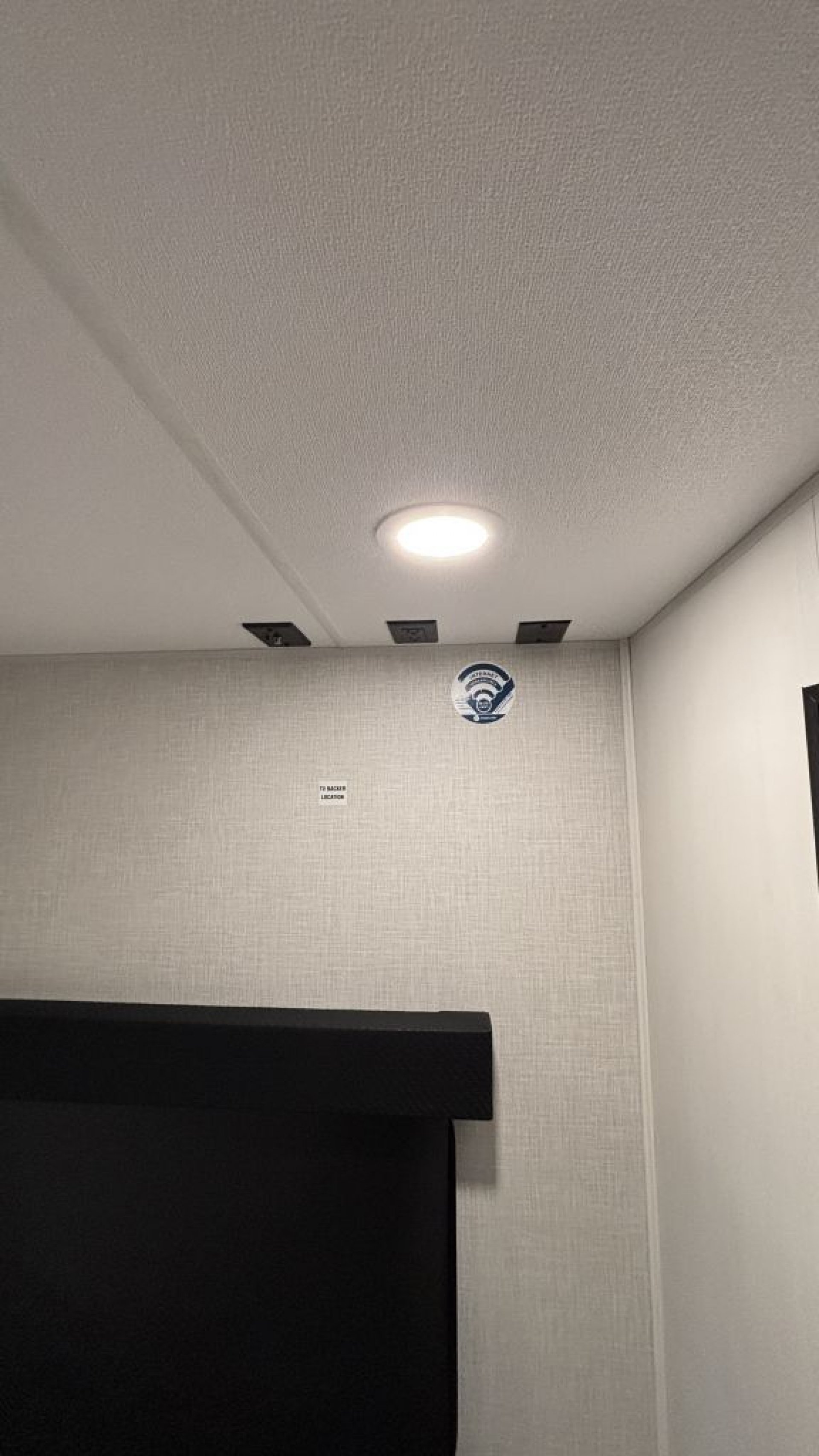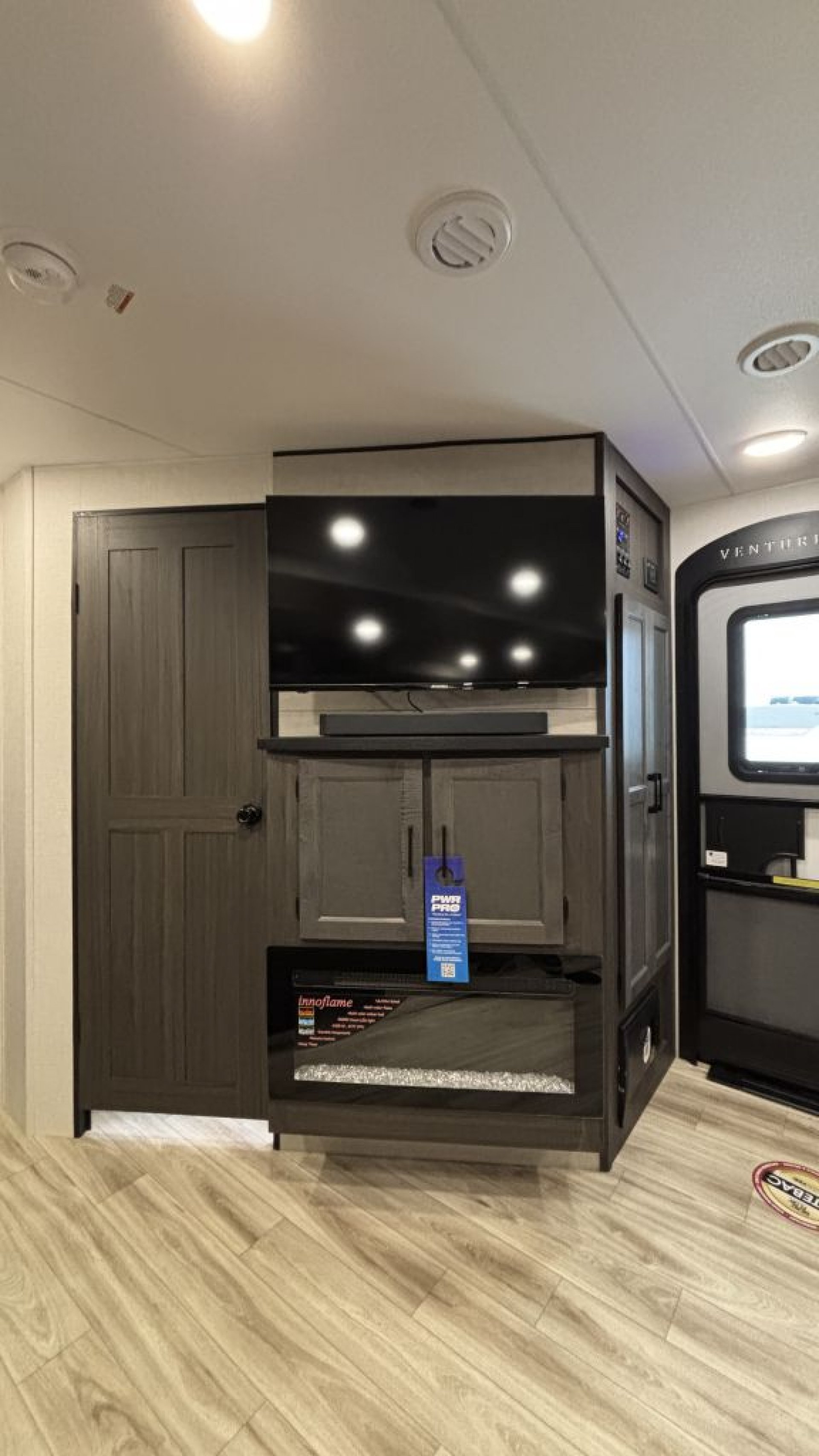 Fireplace & Tech: A standard 5,000 BTU fireplace provides cozy electric heat, complemented by a large LED TV and a multi-zone sound system.